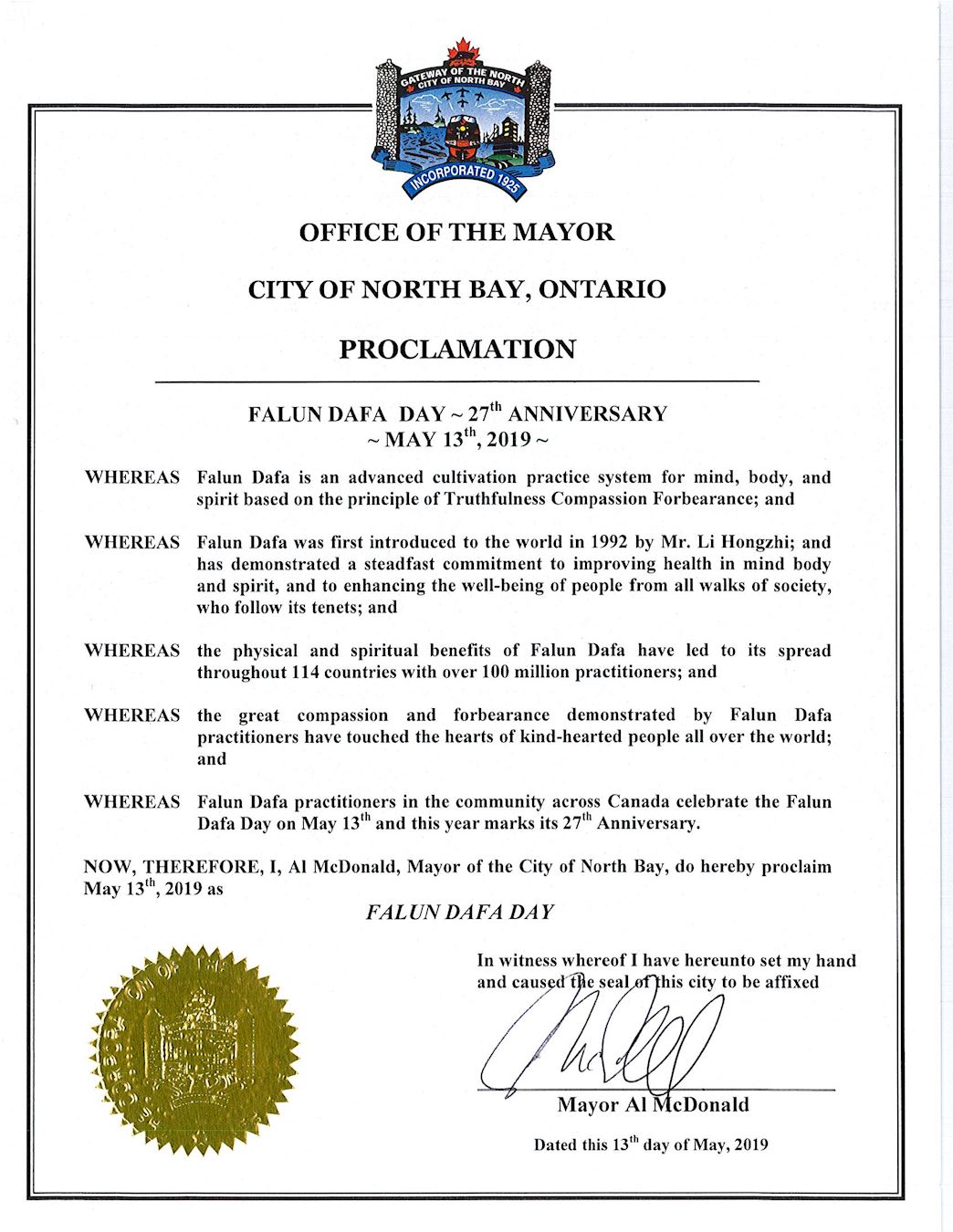 安省康沃尔(Cornwall)市长Bernadette Clement宣布2019年5月13日为康沃尔“法轮大法日”,并褒奖法轮大法。  图8:安省北湾城(North Bay)宣布2019年5月13日为北湾城“法轮大法日”。 |