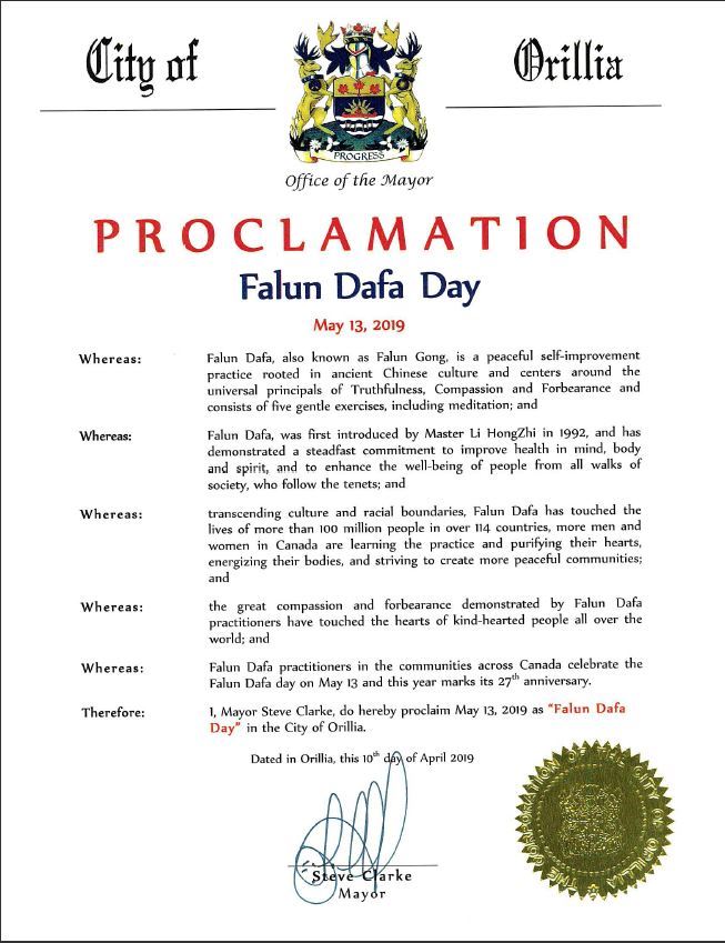 安省北湾城(North Bay)市长Al McDonald宣布2019年5月13日为北湾城“法轮大法日”,并褒奖法轮大法。  图9:安省奥里利亚(Orillia)市长Steve Clarke并褒奖法轮大法。 |