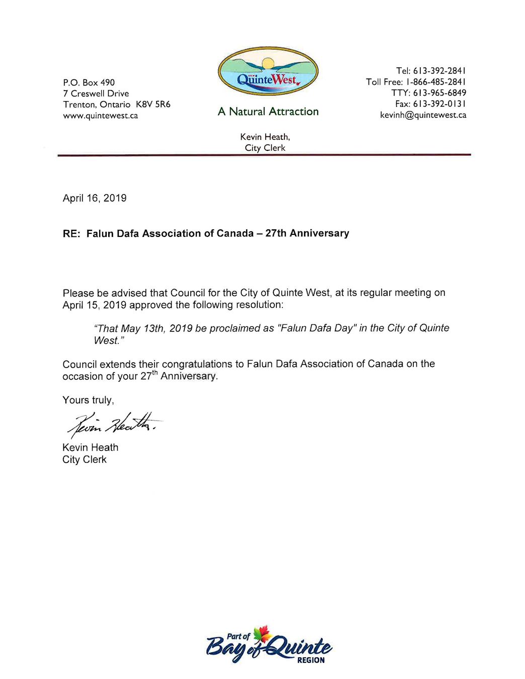 安省奥里利亚(Orillia)市长Steve Clarke宣布2019年5月13日为奥里利亚“法轮大法日”,并褒奖法轮大法。  图10:安省昆特威斯特(Quinte West)市宣布2019年5月13日为昆特威斯特“法轮大法日”。 |