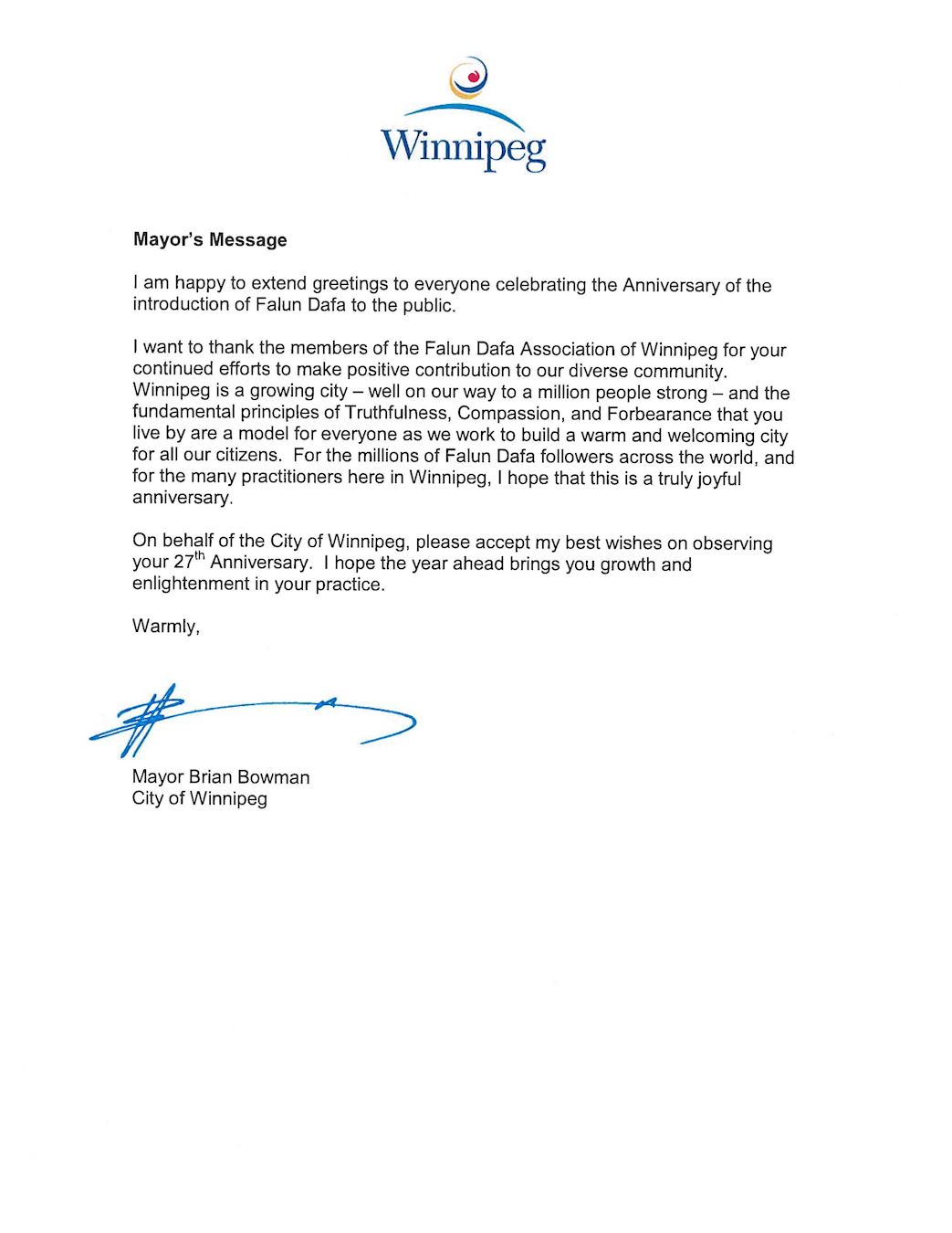 图13:温尼伯(Winnipeg)市长布瑞恩‧褒曼(Brian Bowman)发来的贺信 |