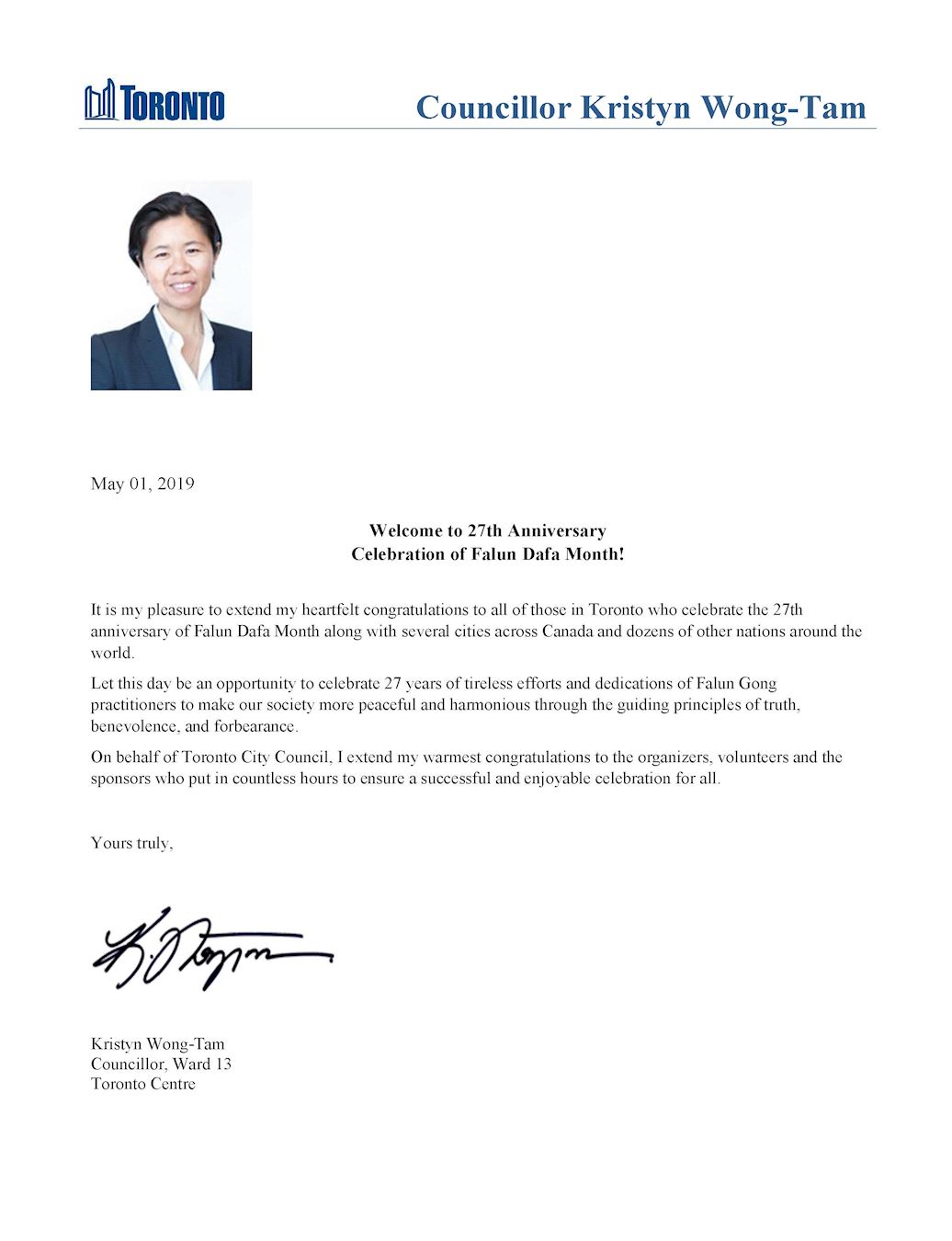 温尼伯(Winnipeg)市长布瑞恩‧褒曼(Brian Bowman)在贺信中说:“我很高兴向所有庆祝法轮大法传世周年纪念日的人们致以问候。我要感谢温尼伯法轮大法学会的成员,继续努力为我们多元化的社区做出积极贡献。” “温尼伯是一个不断发展的城市――人口很快会达到100万。当我们为我们所有的公民努力建设一个温暖和热情的城市时,你们在生活中遵从的‘真、善、忍’基本原则是每个人的榜样。对于全世界数以百万计的法轮大法学员,和温尼伯的许多法轮大法学员,我希望这是一个真正的快乐周年庆祝。” 贺信中写道:“请接受我代表温尼伯市对法轮大法传世27周年纪念的最良好祝愿。希望在未来的一年里,你们在修炼中精進,有更多成长和得到更多的启示。” 多伦多华裔市议员赞法轮功学员27年来坚守“真、善、忍”  图14:多伦多中心玫瑰谷区(Ward 27 Toronto Centre-Rosedale)市议员黄慧文(Kristyn Wong-Tam)。 |