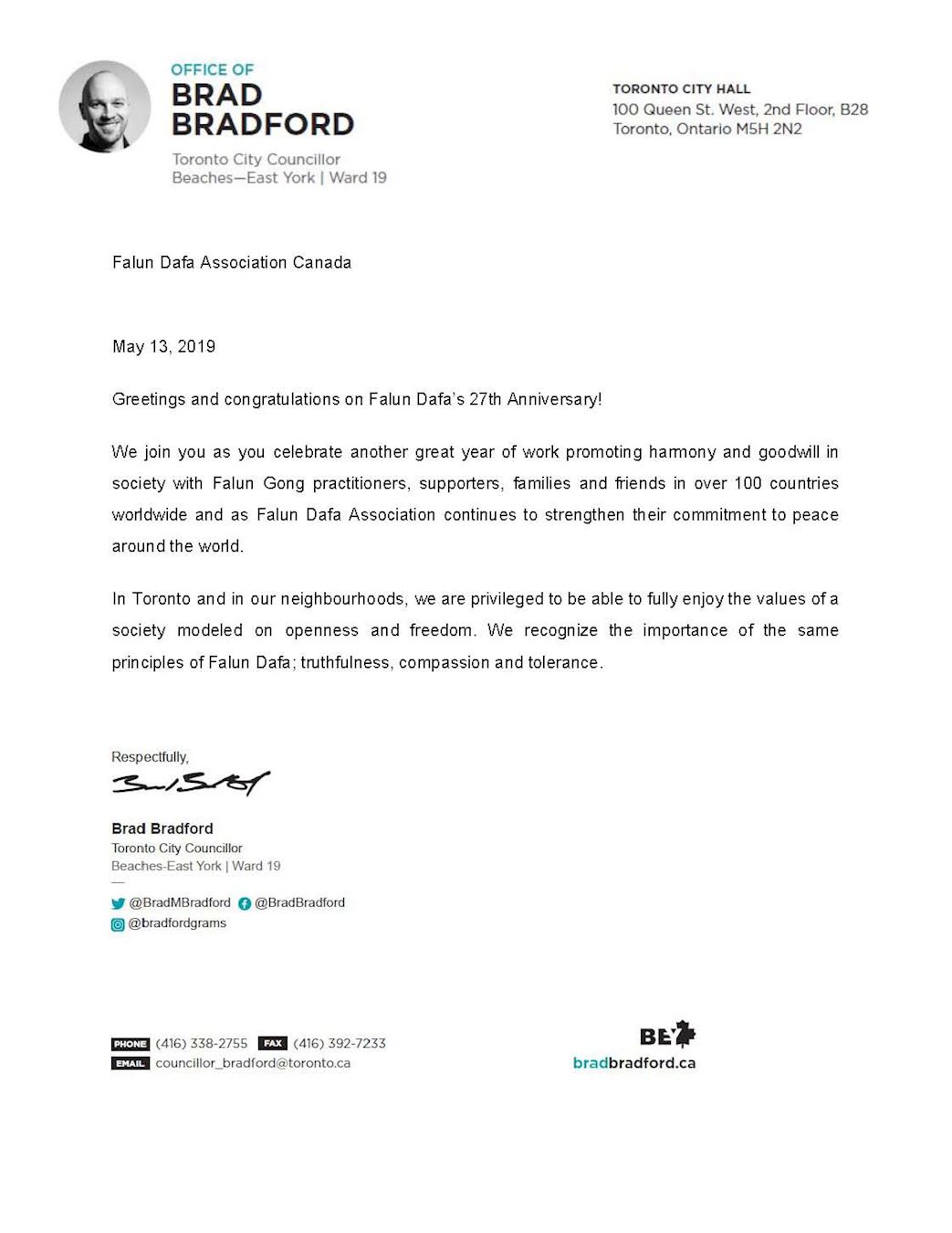 多伦多中心玫瑰谷区(Ward 27 Toronto Centre-Rosedale)市议员黄慧文(Kristyn Wong-Tam)在给法轮大法27周年庆典发来的贺信中说:“我非常荣幸能向庆祝法轮大法传世27周年的多伦多市民,加拿大不同城市的民众和全世界其它国家的民众表达我最真挚的祝贺。” “也让我们借此机会庆祝27年以来法轮功学员坚守‘真、善、忍’的准则,他们不懈的努力和奉献让我们的社会更加和平、和睦。” 贺信中说:“谨代表多伦多市议会,我对活动的组织者、义工和赞助者表示最真挚的祝贺,你们付出了无数的努力确保这场庆典活动获得成功并充满欢乐。” 多伦多市议员:与修炼者一同庆祝大法日  图16:多伦多市Beaches-East York选区市议员布拉德‧布拉德福德(Brad Bradford) |