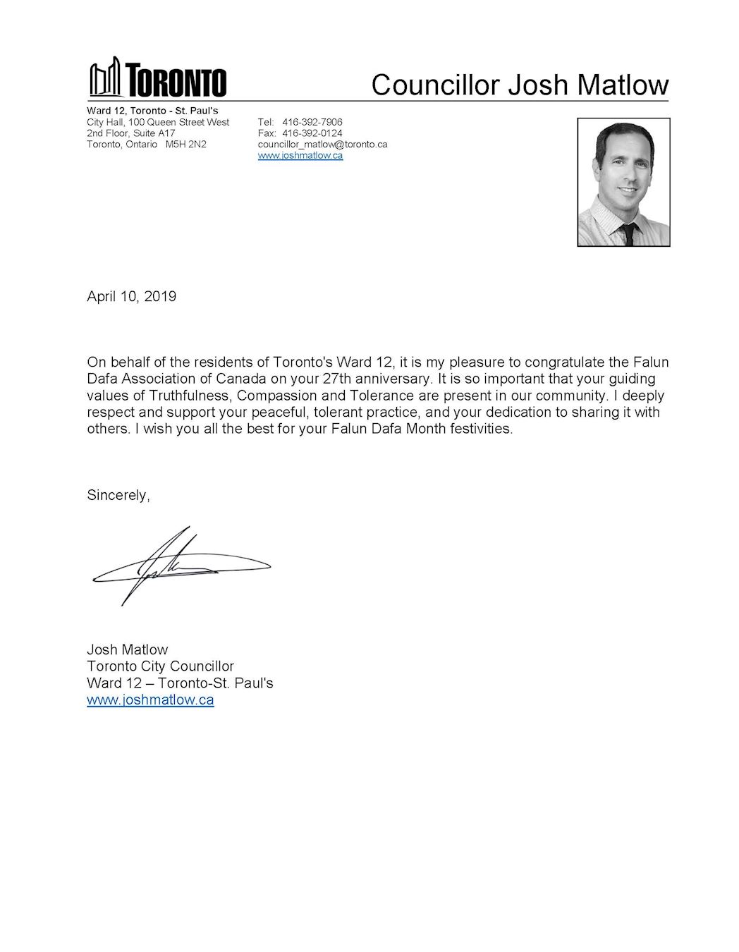 图19:市议员乔希‧马特洛(Josh Matlow)发来的贺信 |