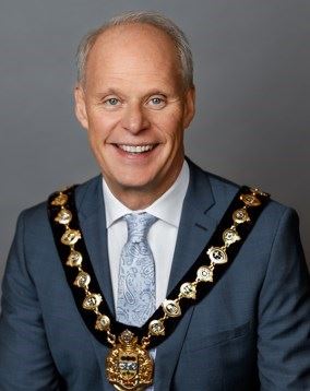 多伦多市议员乔希‧马特洛(Josh Matlow)在贺信中说:“谨代表多伦多12选区,我很荣幸能在此祝贺加拿大法轮大法学会庆祝法轮大法传世27周年。” “你们遵循的‘真、善、忍’原则对我们社区而言极为重要。我由衷尊重你们和平、宽容的践行,以及你们与他人分享这样理念的不懈努力。” 安省奥沙华市市长盼法轮大法为民众带来福份  图20:安省奥沙华市(Oshawa)市长丹‧卡特(Dan Carter)。 |