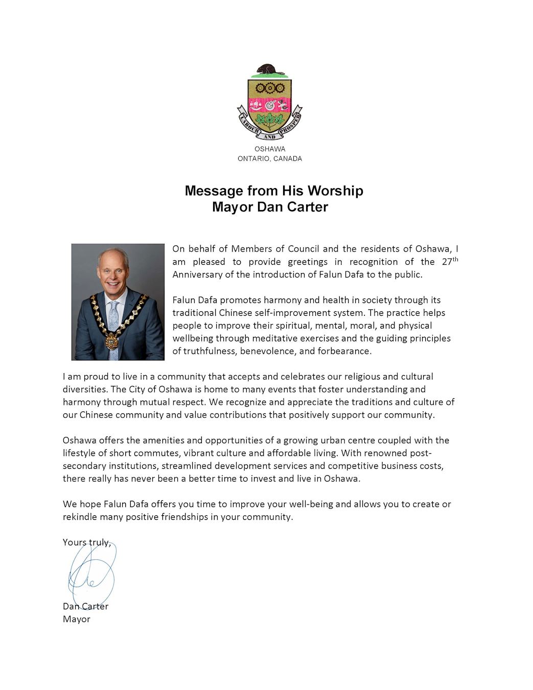 图21:奥沙华市(Oshawa)市长丹‧卡特(Dan Carter)发来的贺信 |