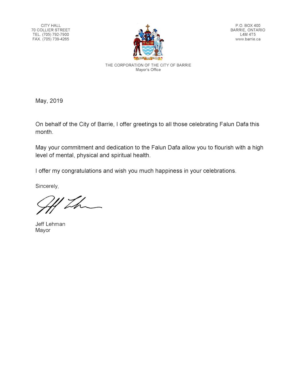 图23:巴里市(Barrie)市长杰夫‧雷曼(Jeff Lehman)发来贺信 2019 Greeting |