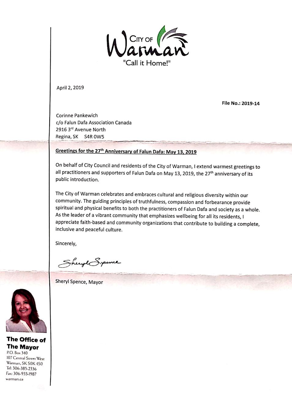 图29:沃曼市(Warman)市长雪莉‧思朋斯(Sheryl Spence)发来的贺信 |