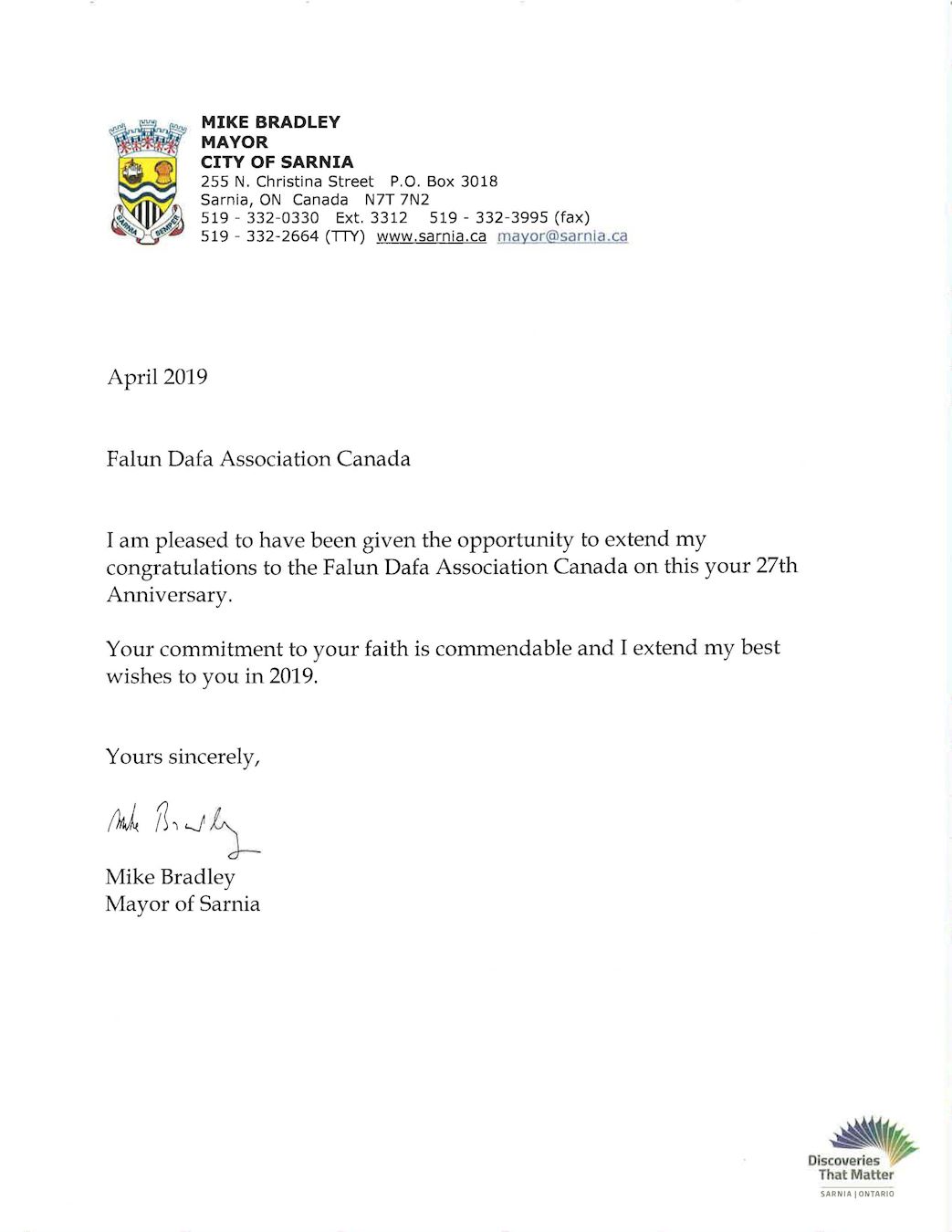 图33:萨尼亚市(Sarnia)市长麦可‧布莱德利(Mike Bradley)发来的贺信 |