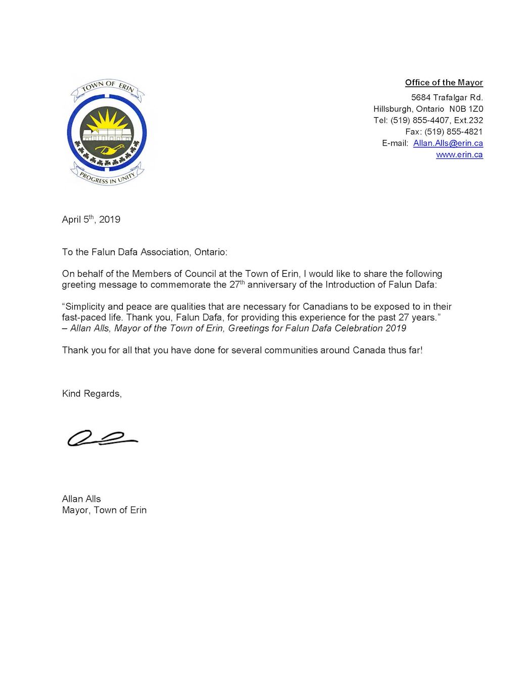 图35:埃兰(Erin)市长阿伦‧阿尔斯(Allan Alls)发来的贺信 |