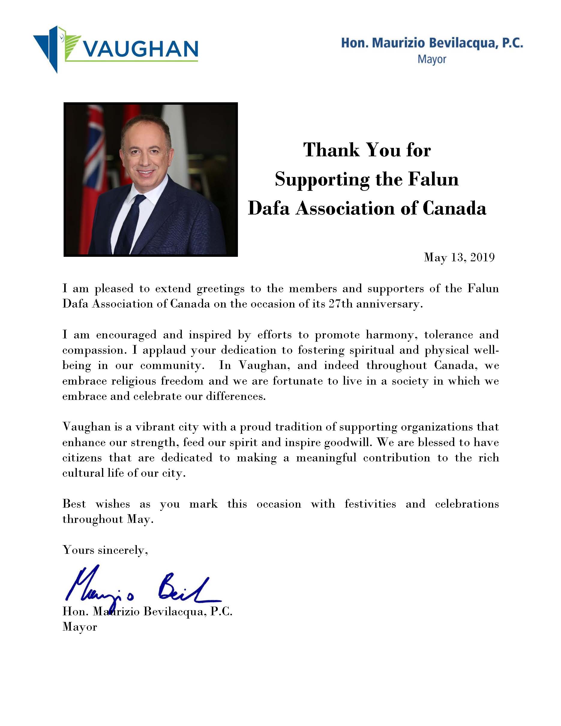 旺市市长马利其奥·贝维拉科沃(Maurizio Bevilacqua)发来贺信表示:“在法轮大法传世27周年之际,我很高兴给加拿大法轮大法学会成员及支持者呈上我的祝贺。” “你们提倡和睦、容忍和慈善的努力给了我激励和启迪,我为你们致力于在我们的社区提升精神和身体健康喝彩。在旺市,在整个加拿大,我们拥抱信仰自由。我们很荣幸能生活在一个包容和尊重不同文化的社会。” “旺市是一个活泼的城市,有一个令人自豪的传统,就是支持那些增强我们的实力、丰富我们的精神、启迪良好愿望的团体。我们很幸运能有这些公民致力于为我们城市的文化生活做出有意义的贡献。” “当你们在5月份举办各种庆祝活动时,请接受我最良好的祝愿。”