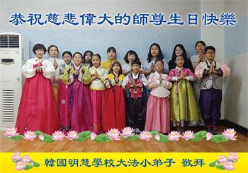 黑狱黝黝同修携手闯 法光融融共御世下流 师尊谆谆大法开智慧 众生欣欣精進佛恩悠 旅居马来西亚大陆大法弟子 韩国明慧学校大法小弟子恭祝慈悲伟大的师尊生日快乐!