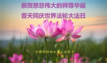 沙特阿拉伯全体大法弟子恭祝慈悲伟大的师尊华诞!感恩师尊慈悲苦度!普天同庆世界法轮大法日!大法弟子叩拜!合十 香港全体大法弟子恭贺师尊华诞!庆祝世界法轮大法日!