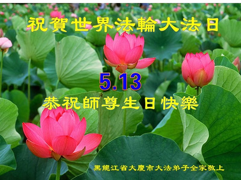 大庆一家三口大法弟子恭祝师尊生日快乐! 庆祝5.13世界法轮大法日! 代表黑龙江省大庆所有真修大法弟子向师尊问好!祝师父生日快乐!