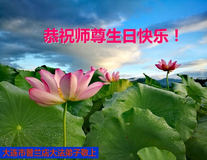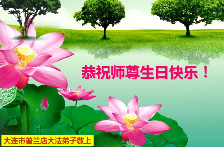大连青年弟子恭祝师尊生日快乐!弟子感恩师尊的慈悲苦度,无法用语言诉说。在这浊世的滚滚红尘中,如何从人中走出来,如何按照法的标准走正、真正达到法的标准,弟子差的太远,也看到自己的差距。在接下来的日子里,弟子要做的更好更正,请师尊放心!请师尊加持! 辽宁省大连市普兰店全体大法弟子恭祝师尊生日快乐!普天同庆世界法轮大法日!