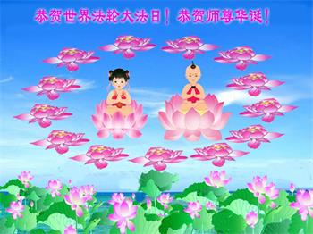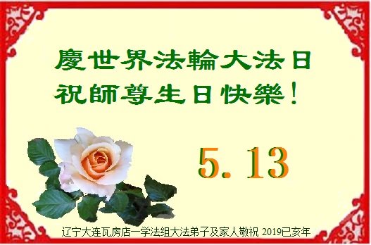 恭贺世界法轮大法日暨师尊华诞!每当想起师尊为我们无条件的付出,我们内心愧疚,难以表达对师尊的感恩,对师尊的敬意,我们全家谢谢师尊。学好法,做好三件事,多救人,让师尊多一份欣慰,让自己少一份遗憾。精進在精進,跟师尊圆满回家。叩拜师尊! 二零一九年五月十一日 辽宁省大连瓦房店大法弟子恭祝师尊生日快乐!恭贺世界法轮大法日!