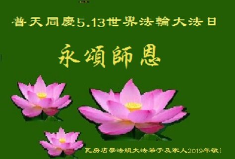 感恩五一三 旷世不遇大法传 师恩恩重大无边 挽救众生与苍宇 惊天动地挽狂澜 邪恶势力要考验 狰狞面目魔鬼脸 狂风呼啸掀恶浪 不知天外还有天 惊涛骇浪二十年 雪雨冰霜铁索寒 牢狱酷刑千般虐 法徒志坚心如盘 全球感恩五一三 佛恩浩荡语难言 四海同心归正道 正法史册广流传 大连市甘井子区一学法小组全体大法弟子敬上 二零一九年五月十日 辽宁省大连一大法弟子恭贺伟大的师尊生日快乐!