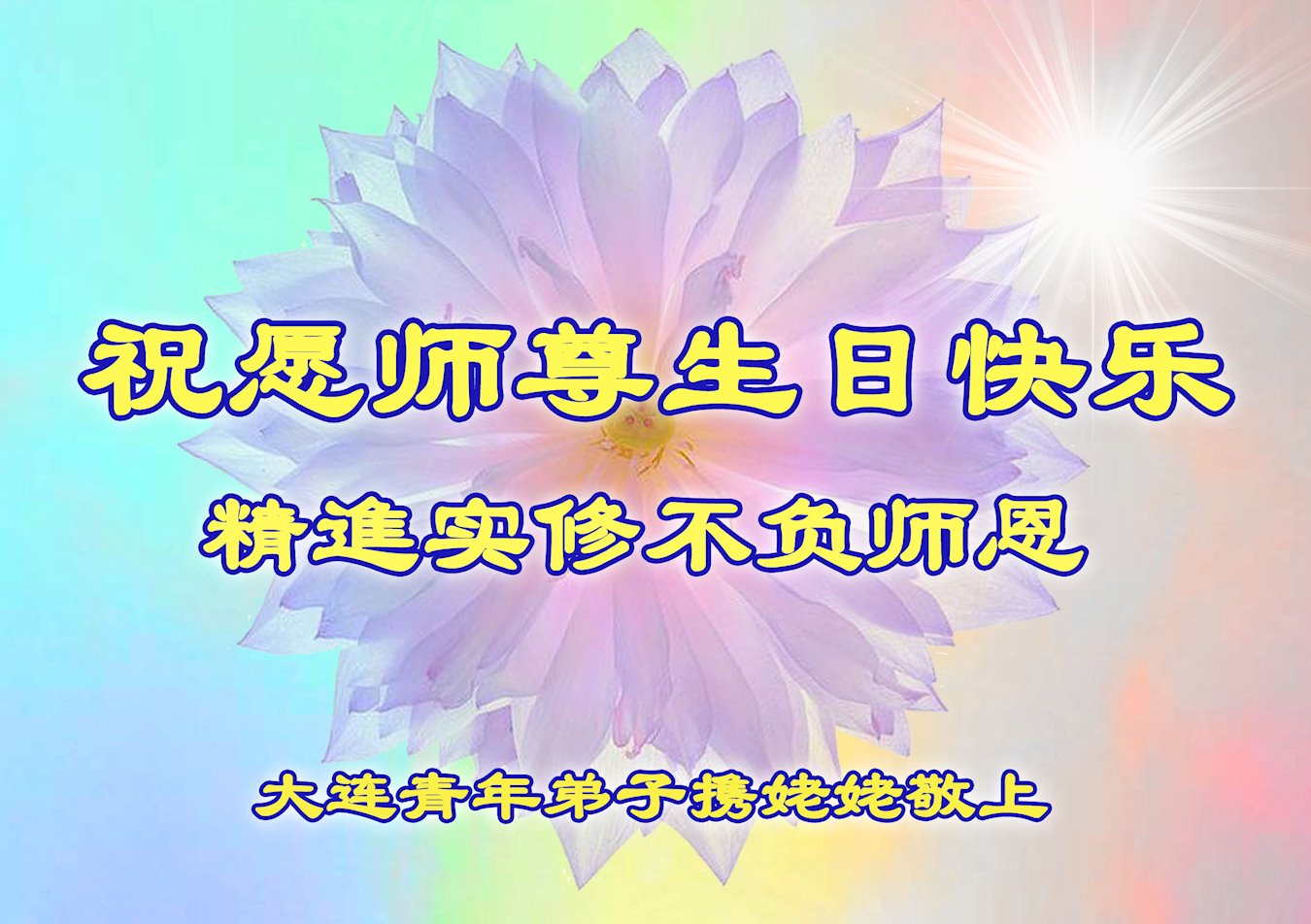 师尊生日快乐!感恩师尊救度,弟子坚定、精進,不负师尊苦度。 辽宁省大连市大法弟子及家人恭祝慈悲伟大的师尊生日快乐!恭贺世界法轮大法日!