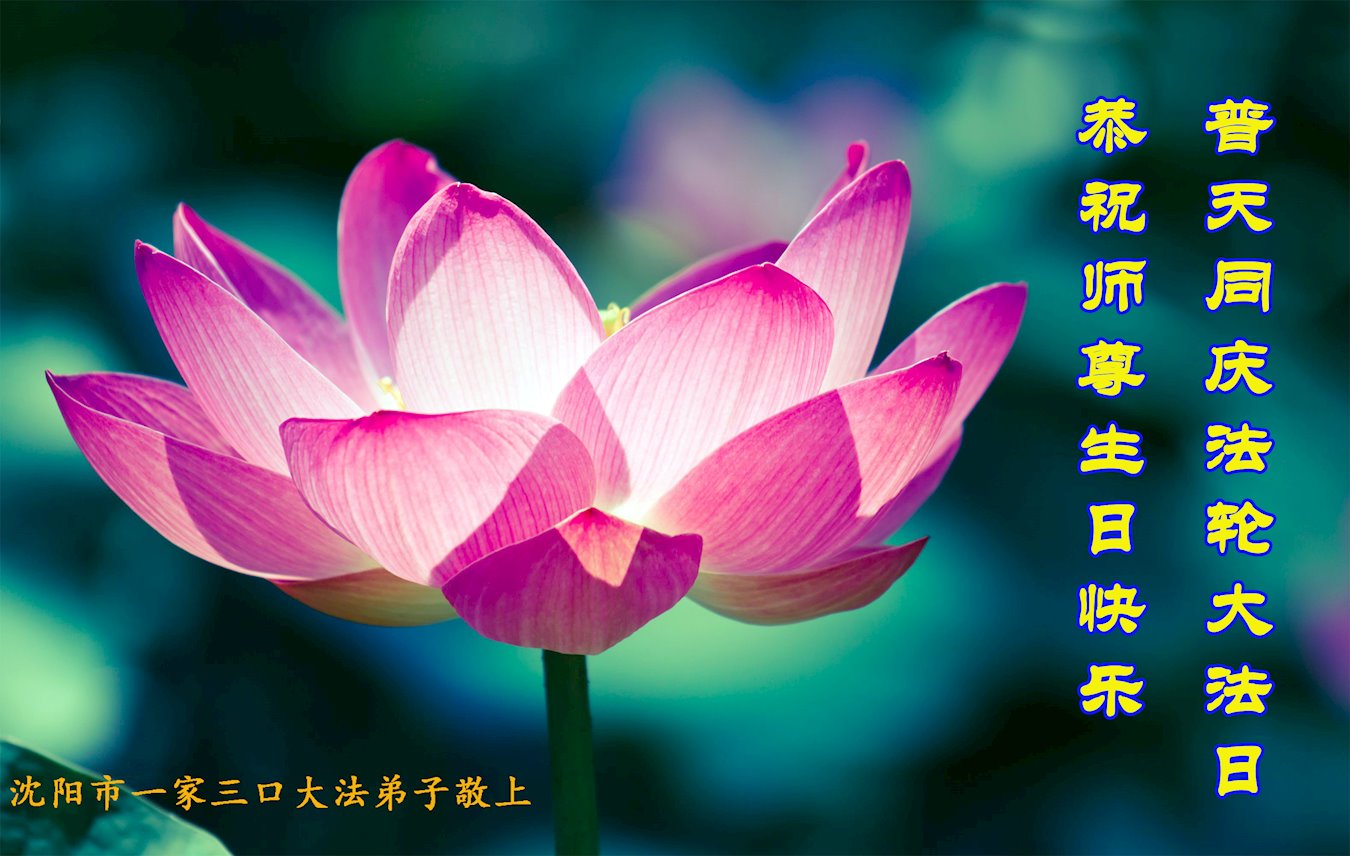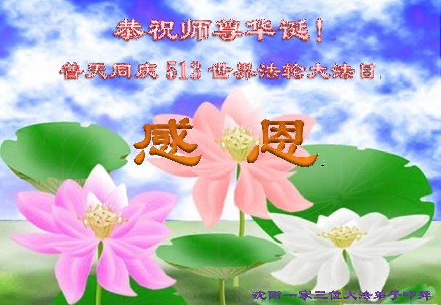 感恩师尊慈悲苦度!在今后有限的时间里,弟子唯有更加精進,正念正行做好三件事,多救人。 沈阳一家三位大法弟子叩拜! 辽宁省沈阳市杨士地区全体大法弟子恭祝师尊生日快乐!恭贺世界法轮大法日!