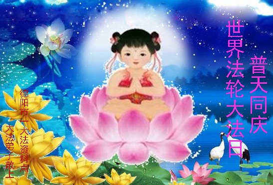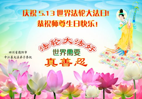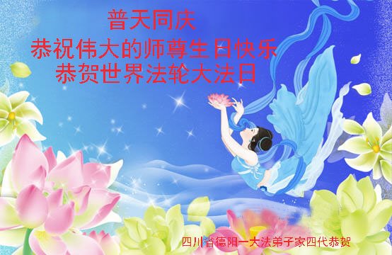 四川省德阳市一家庭资料点大法弟子恭祝慈悲伟大的师尊生日快乐!恭贺五。一三法轮大法日!
