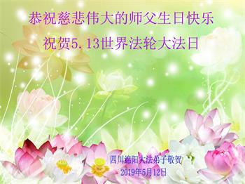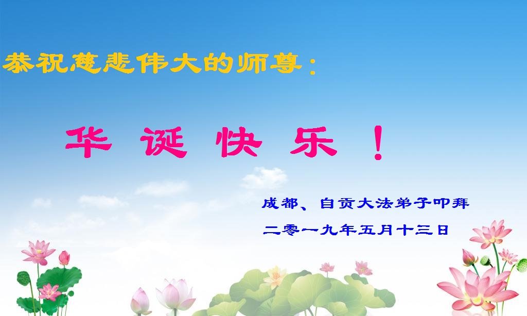 祝师父生日快乐!早日回大陆,福泽众生。 四川成都彭州大法弟子叩拜 2019年5月12日 四川绵阳大法弟子恭祝师尊生日快乐!