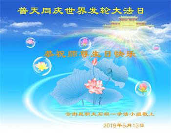 万象更新,新宇来临。我们大法弟子以崇敬的心情,恭迎来了普天同庆、同颂的世界法轮大法日!同时,以崇敬的心情恭迎来了,普天同庆、同颂、同贺的慈悲而伟大的师尊华诞!感谢师尊为我们的辛勤操劳!为我们大法弟子以及众生的辛勤的付出,恩比天高!真诚的向师父道声:师父您辛苦了!谢谢师父!感恩师尊的慈悲苦度,感恩师尊与大法!跪拜师尊叩首谢恩!恭贺神圣而伟大的世界法轮大法日!恭祝慈悲而伟大的师尊生日快乐! 五月颂歌 金锣鸣 鞭炮脆 仙乐飘飘九天鸣 鲜花飘如雪 群山舞 苍海笑 艳阳高照 佛露春风满天宇 大地绿 众生笑 世人醒 真相明 感激大法恩 万物朝圣 百花齐放 百鸟争鸣 三界同欢庆 世界法轮大法日 千言万语万语千言,一句话:感恩师尊!不忘誓约与使命!多学法更加努力精進实修!不负师尊期望!代我们学法小组全体同修向师父问好!恭贺神圣而伟大的世界法轮大法日!恭祝慈悲而伟大的师尊生日快乐! 四川凉山州西昌大法弟子法缘 敬上 云南昆明大石坝大法弟子恭祝师父生日快乐!