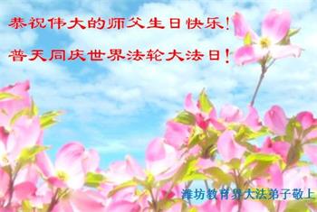 山东省潍坊教育界一家大法弟子恭祝慈悲伟大师父生日快乐!