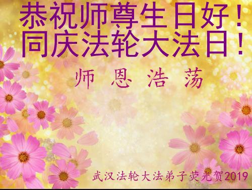 潍坊教育界一家大法弟子恭祝慈悲伟大师父生日快乐! 二十三个春秋,伟大的师父把我这个百病缠身、自私自利的生命,净化成身体健康,无私为他的大法弟子,这过程倾注了师父多少心血,多少精力,我无以言表,江河日月见证了师父的浩荡佛恩,弟子唯有精進实修,向内找,多救人,才配做师父的弟子,让师父多一份欣慰,少一份操劳。叩谢恩师! 潍坊教育界一家大法弟子敬上 2019.5.12 湖北省武汉市四个学法小组及全体湖北大学大法弟子恭祝师尊生日快乐!