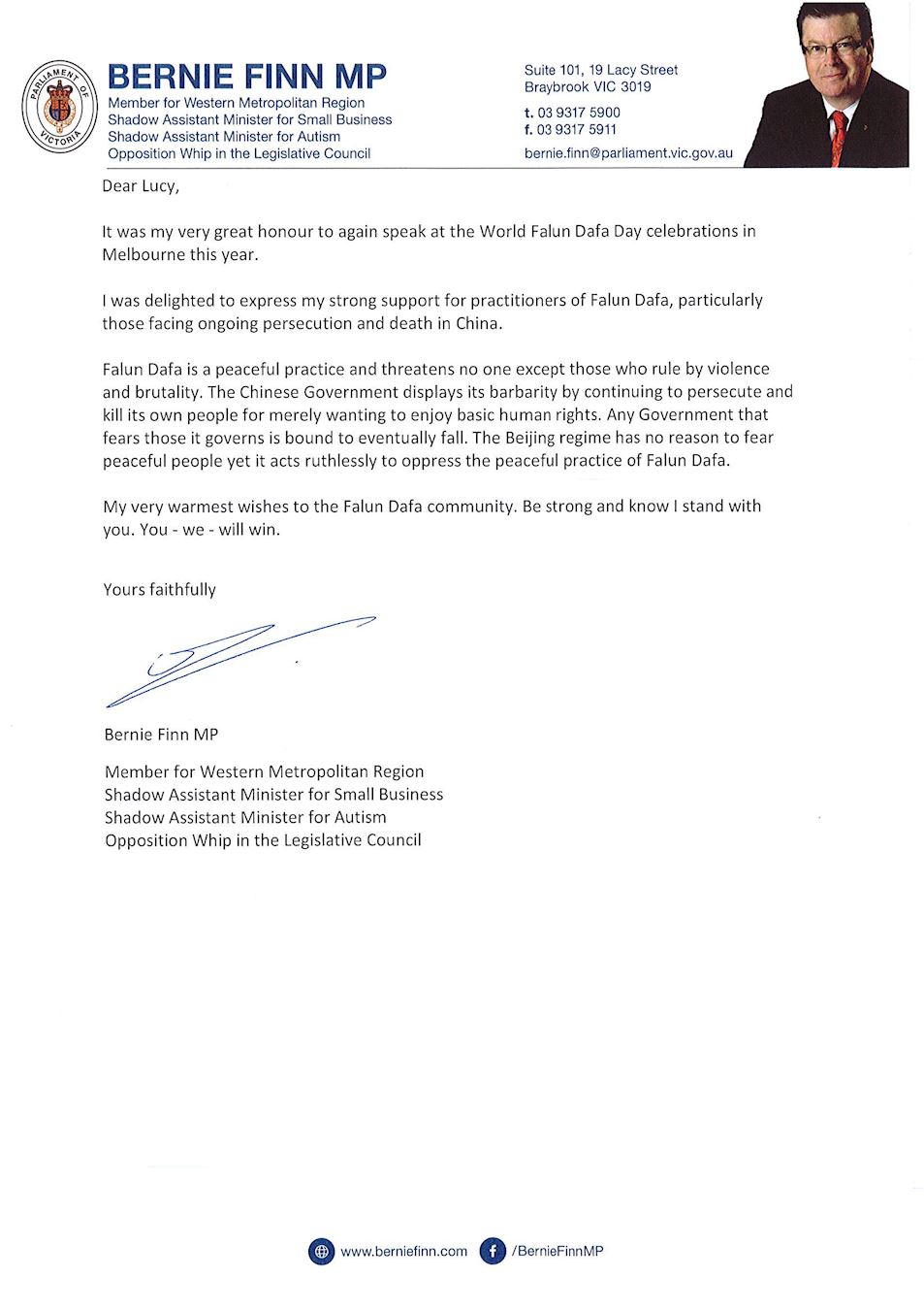 图2:维州自由党上议院资深议员、反对党党鞭伯尼·菲恩(Bernie Finn MP)先生发来贺信表达对法轮功学员的祝贺和支持。 |