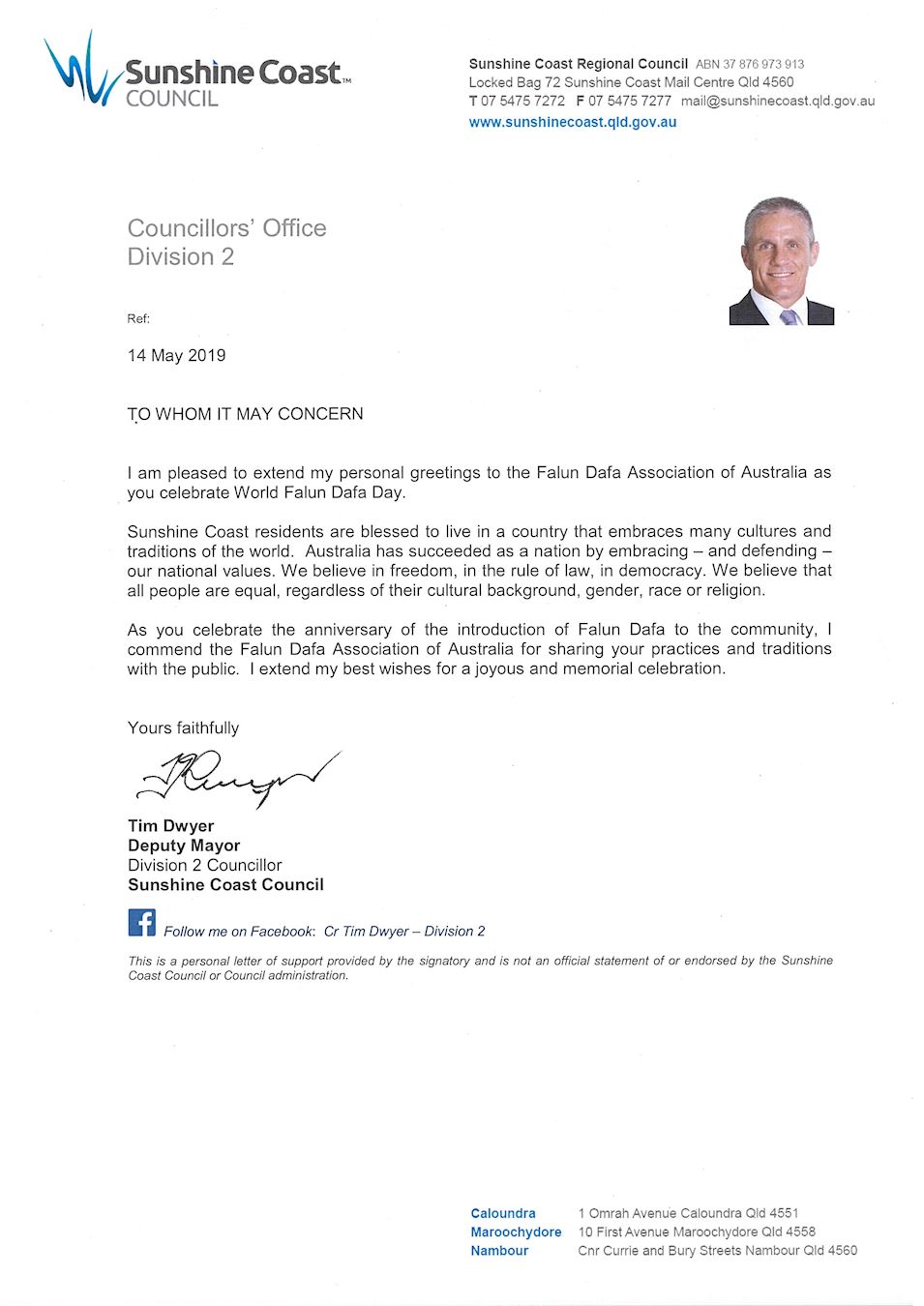 昆士兰州克洛斯沃利海岸(又称食火鸟海岸)市议会(Cassowary Coast Regional Council)市长克雷马斯托斯(John Kremastos)的贺信全文如下: 作为克洛斯沃利海岸市议会(昆士兰州最北部)的市长,能有机会以书信的方式献上对世界法轮大法日的支持,感到非常欣喜。 法轮大法是中国传统的“修炼”方法,能促进身、心、灵的健康。 澳大利亚人有幸生活在一个拥抱多种文化以及世界传统的国家,我们也很自豪能坚守道义良知以及宗教自由的澳洲价值观,这些价值观是我们民主社会的基础。 本人非常感佩澳大利亚法轮大法学会把这一精神修炼方法带给澳洲,并对你们欢乐、难忘的庆典致以最美好的祝福。 您的诚挚的 Cr John Kremastos 克洛斯沃利海岸市议会市长(Mayor, Cassowary Coast Regional Council) 昆州阳光海岸市议会副市长祝贺世界法轮大法日  图4:昆州阳光海岸市议会副市长德怀尔(Tim Dwyer)致信祝贺世界法轮大法日。 |