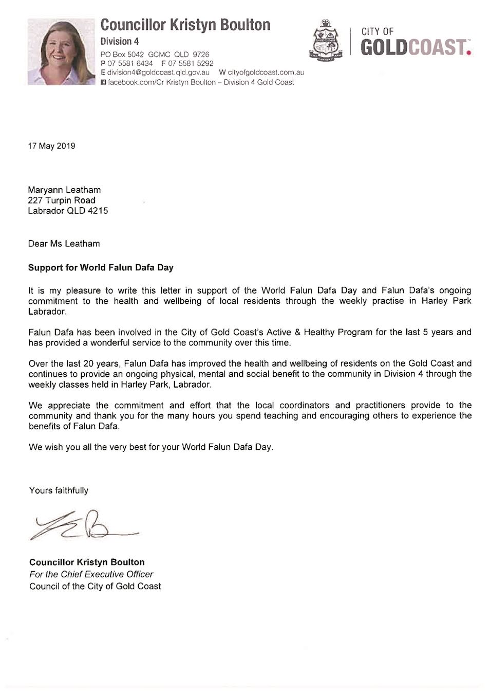在庆祝世界法轮大法日之际,很高兴能向澳大利亚法轮大法学会献上本人的祝福。 阳光海岸的居民有幸生活在一个拥抱来自世界各地的多种文化及传统的国家。澳大利亚的成功在于秉承我们的国家价值观。我们坚信自由、法制、民主,我们也坚信人生来平等,无论其拥有何种文化背景、性别、种族或宗教。 在庆祝法轮大法广传社会的周年纪念日之际,本人赞佩澳大利亚法轮大法学会与大众分享你们的修炼方法和传统价值,并对你们的赏心悦目、铭刻在心的庆典致以最美好的祝福。 您的诚挚的 Cr Tim Dwyer 阳光海岸市议会副市长(Deputy Mayor, Sunshine Coast Council) 昆州黄金海岸市议员感谢法轮功学员造福居民  图5:昆州黄金海岸市议员(City of Gold Coast)博尔顿(Cr Kristyn Boulton)女士致贺信感谢二十来来法轮功学员为造福社区付出的努力。 |