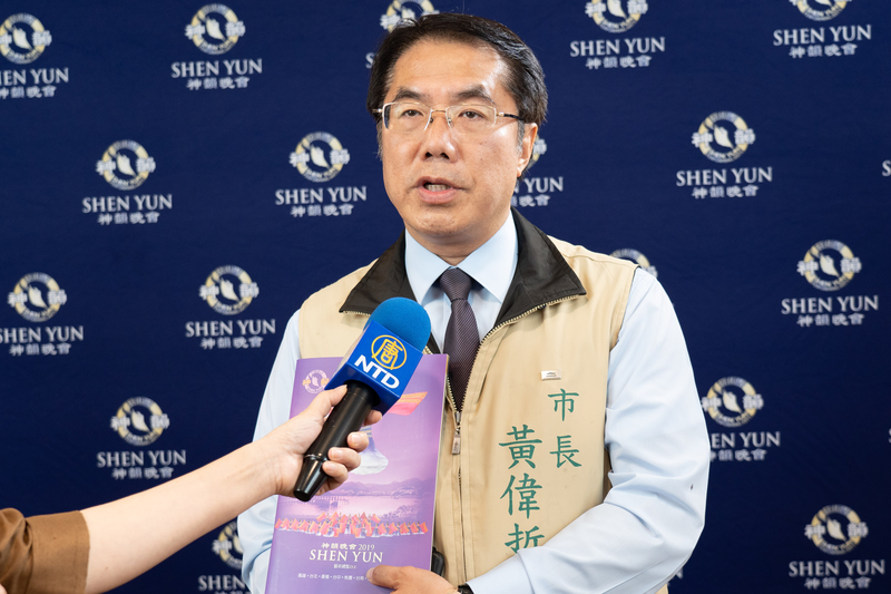 “一般人如果只来第一次,会觉得布景很华丽,第二次来会觉得演员演得很到位,第三次整体的感觉会让你很震撼!就是说她必须被细细的品味。”多次观赏神韵的蔡适应说,“这次来觉得其中的故事涵意深远,她在传递中国历史长河的流动,中国文学故事的博大精深。” 蔡适应描绘,“她从第一幕文化的开展,一直到最后,整个演出的过程一气呵成。”“神韵整个演出过程,事实上就是展现整个中华文化的瑰宝,除了讲述历史之外,还有(呼吁)我们要珍惜中华文化。”他盛赞神韵将中华文化完整保留下来。 蔡适应强调现在的中国文化在中共统治下,“是被限制的、被压抑的,它不允许创作的自由、不允许信仰自由,我觉得这是很可惜的事。”反之,“有些东西在对岸的中国已经被禁止或者消失或者不见了,神韵艺术团把他完整的保留了下来,透过舞剧展现了出来,我觉得看这个演出,远比到中国本地去看风景还来得更有感触。” 他呼吁中国官员要来看神韵,“也许他们对国家政策、外交政策会有所改观吧!” 台南市长:神韵艺术造诣创新高 立下典范  图4:四月三十日晚间,台南市市长黄伟哲在开演前特别前来向神韵艺术团致意,并鼓励台南乡亲应踊跃多看神韵。 |