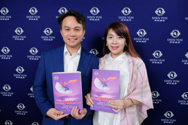 “神韵是神圣伟大的创作。”音乐总监首次欣赏神韵演出后赞叹不已。他表示,对于创作者而言,神韵展示了永无止境的艺术追求,欣赏神韵,能让创作有所成长。 “把实境、所有的表演融入科技中,所以不论是制作编排的剧情、动画,或许已经做到快要4D的感觉,让观众非常溶入在节目中。”黄伟霖赞叹动态天幕带给观众的视觉震撼。 此外,舞蹈的谐合度、默契配合完美也令黄伟霖印象深刻,身为音乐人的黄伟霖说,神韵音乐中西乐器合璧,音乐家们烘托台上的演出,“非常可敬可佩!”“不论是选的乐曲或者是创作,让听众能够用视觉、听觉融入这个意境,非常棒!”“真的是无懈可击!”他表示,“我们会欣赏到她(音乐)的强弱,她与剧情的扣合非常棒,我无法形容。” 节目最后一幕,让黄伟霖非常感动,“她(神韵)会让你知道,自己心中要有神、要有佛,或者是要有为善的心态,要不然神佛都在看你。”黄伟霖赞叹,“真的神圣伟大!”对灵魂人物艺术总监及艺术家的付出,黄伟霖表示“万分的钦佩,希望神韵持续为了我们的文化艺术再提升。” 艺术画廊行销总监:神韵带来天国文化  图12:国际餐饮执行董事、艺术画廊行销总监王筠铱(右)与先生建设公司副总经理洪志明,于四月二十日晚上观赏神韵在台中中山堂的演出。 |