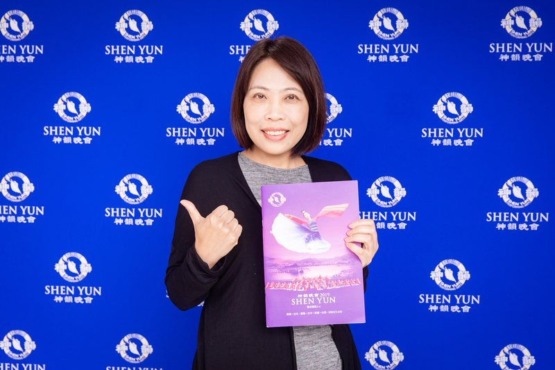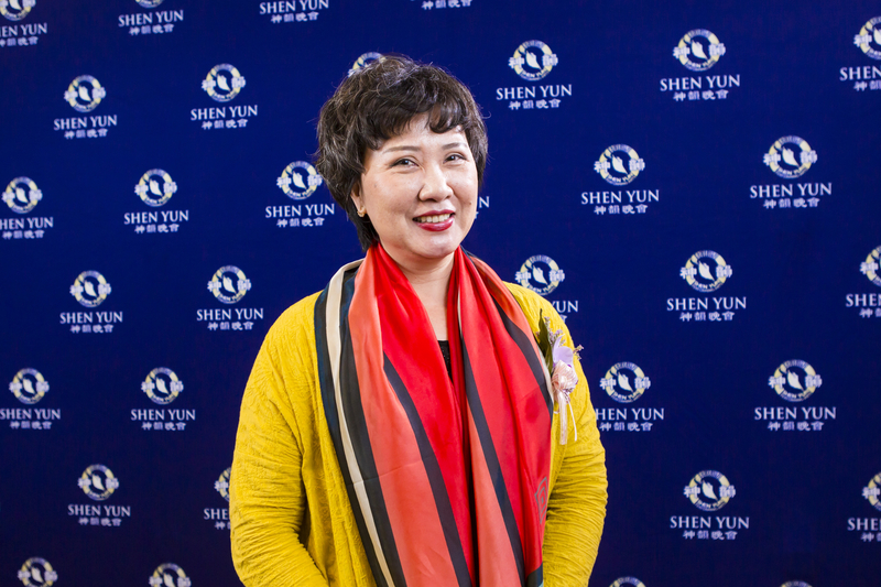 王筠铱和先生、建设公司副总经理洪志明在观赏演出过程中,闻到阵阵檀香气味,让她直觉感受到,有神佛的力量,“我觉得在表演的时候,神佛其实都在其中,整个磁场都是很宁静的,就是有一种很peaceful(平和)的、与世隔绝的那种感觉。” 原以为是特效安排的洪志明也认为,闻到檀香味“代表神与我们同在”。 “很多艺术家能看见天国的样子,然后把她画出来,或是创作出来,”王筠铱认为,神韵的艺术家就是藉由舞蹈、歌唱、艺术,“把天国的文化带下来了”。其中,神韵的色彩美学让学服装设计的王筠铱赞叹不已。她说,神韵的服装颜色让人印象深刻,她描绘最喜欢的《彝舞倩妹》,舞蹈演员在挥动裙摆时,“喔!那个颜色,就象彩虹般的绚丽。”她赞叹,神韵“大量采用很鲜艳的色彩。”让人仿佛“看到天国的文化!” 王筠铱指出,“神韵所演出的故事,其实都在告诉我们,我们来的使命是什么,不要忘记行善。”这样的内涵,给她带来了启发,她觉得生活中也该实践“真、善、忍”。过去一年,她秉持“真、善、忍”的原则,用真心、善良的心对待客户,为别人着想。 大陆观众:神来到跟前了 “神韵表现了中国人的特色,真的是整个中华民族的特色!”大陆观众周先生(化名)观赏神韵后赞叹道。四月二十一日下午,神韵在台中中山堂的最后一场演出,他感动的说,“太美了,实在是太感人了,我很希望(神韵)能够到大陆去。” 大幕一拉开,他就大为感动,“我的眼泪情不自禁地流出来了。”他说:“第一幕感受是最深的,就象神到我跟前来了,我真的感觉有一股热流,一股力量,全身发热。” 他觉得每个节目都表现出人与天、人与传统之间的连结,他以舞剧《女儿国》为例,“象《西游记》那个节目,人能跟神沟通,现在在大陆根本看不到。”他又举《月宫会嫦娥》为例,“看到非常可亲,感觉就象嫦娥来到人间。”他再次强调,“以前人和神可以沟通,”今天看到神韵现场演出,就感觉“神来到跟前了”。 狮子会长赞神韵“神来之笔” 四月二十九日晚间,国际狮子会300D1区春晖狮子会会长陈淑娟,观赏神韵世界艺术团在台南文化中心演艺厅的演出后,盛赞神韵,“让我精神振奋,灌注我满满的能量,可以面对未来的明天。”  图13: 国际狮子会300-D1区春晖狮子会会长陈淑娟观赏四月二十九日神韵世界艺术团在台南文化中心的演出。 |