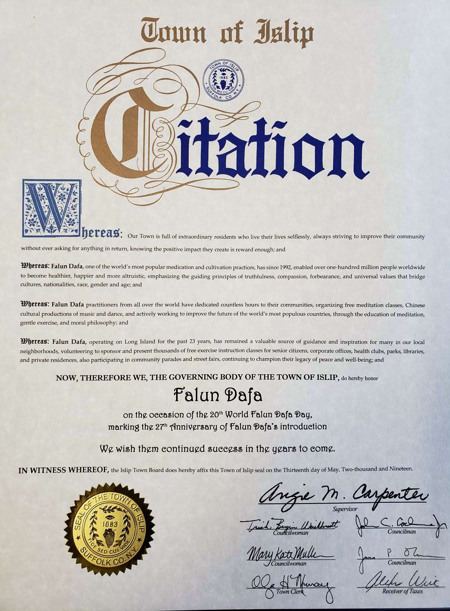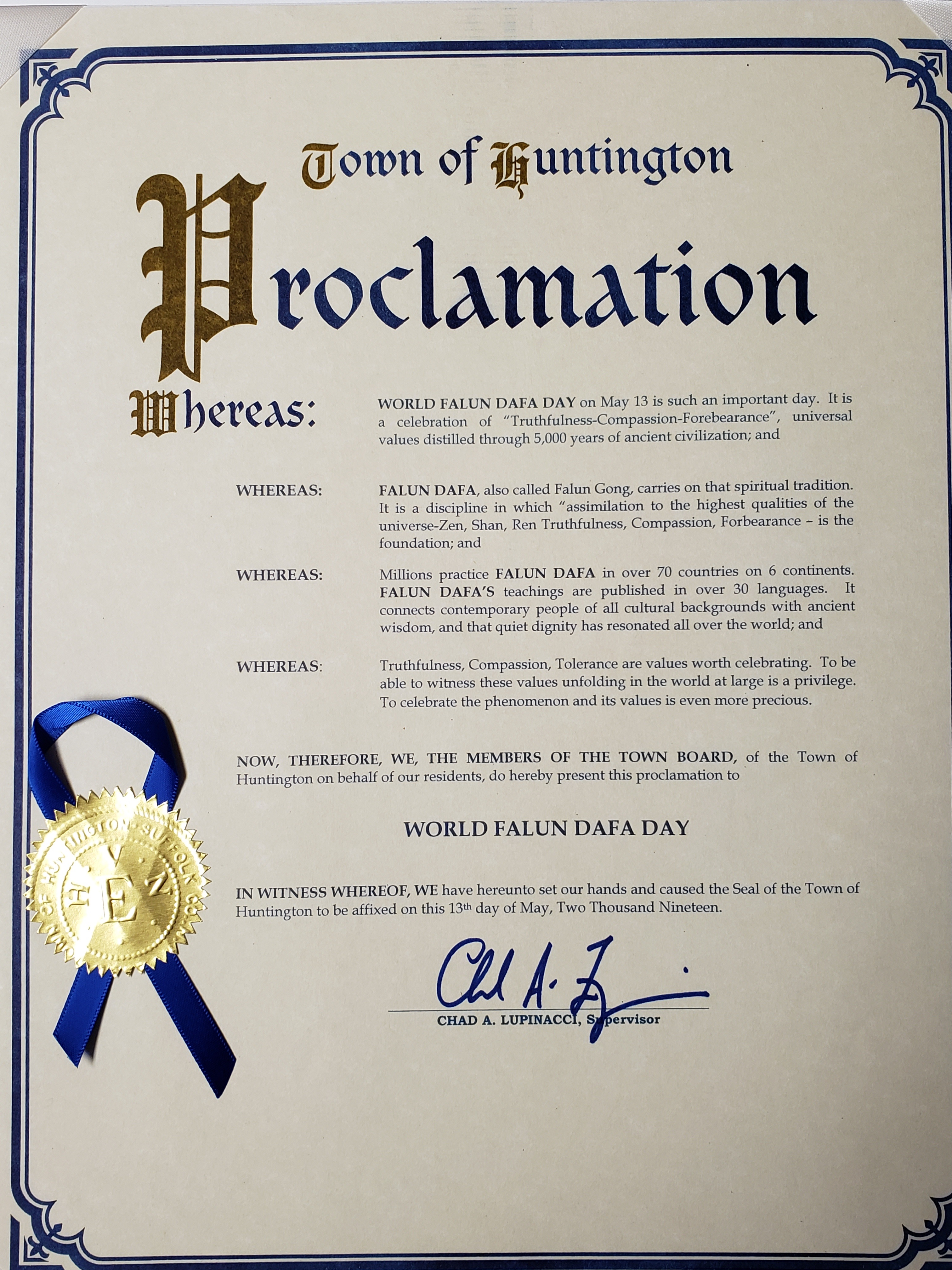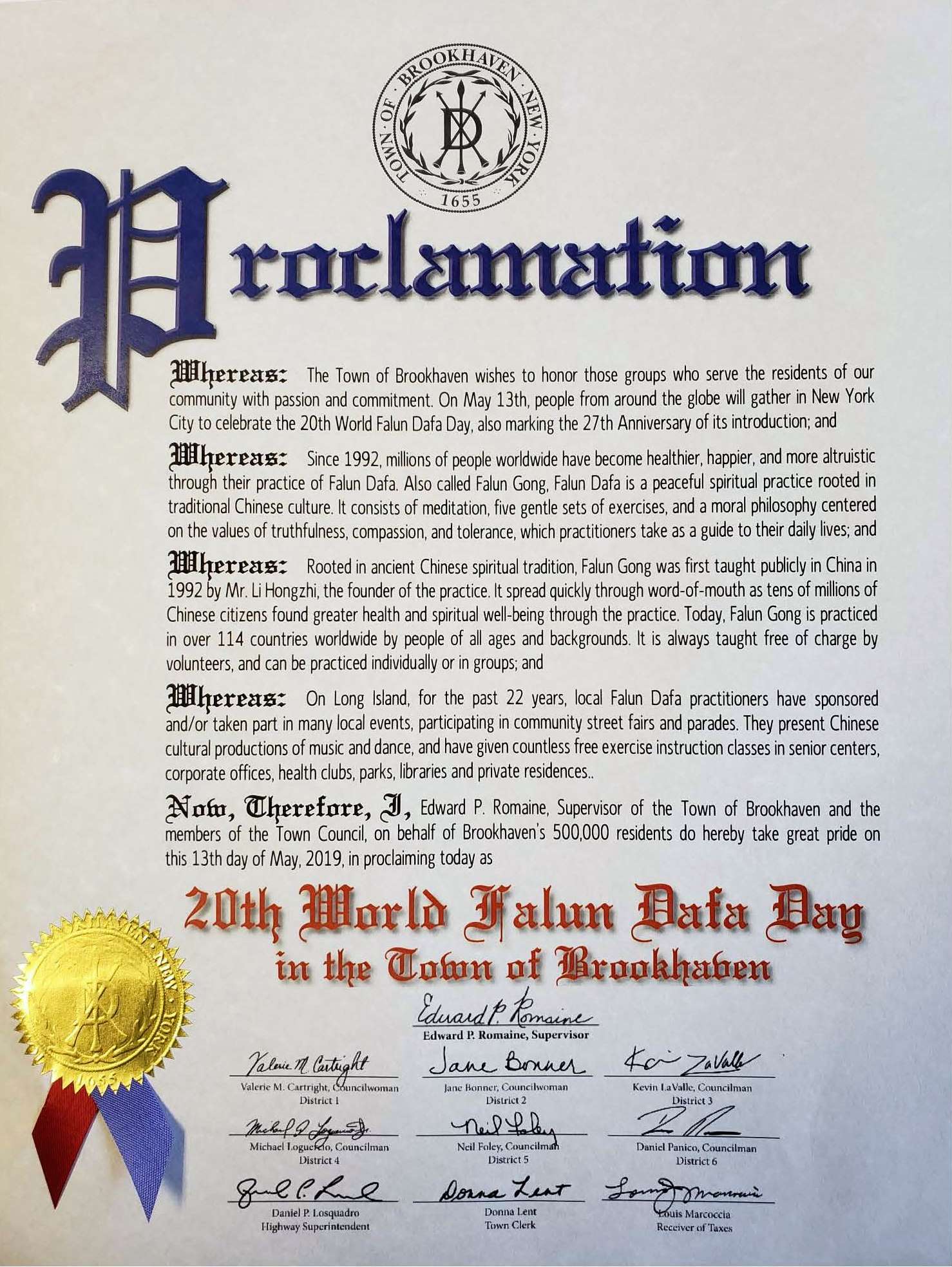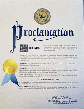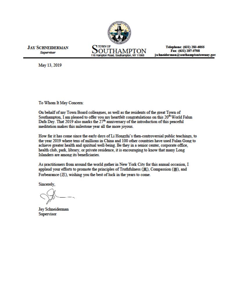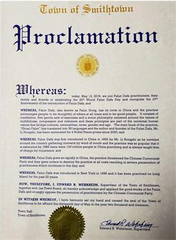 史密斯敦镇褒奖大法日,强烈谴责迫害 褒奖译文如下: 鉴于:今日,2019年5月13日,我们与法轮大法学员及其亲友共同庆祝第20届世界法轮大法日并嘉奖法轮大法开传27周年。并且: 鉴于:法轮大法,也称法轮功,起源于中国。其鼓励人们随时随地为他人着想并且做一个好人。他有打坐,5套柔和的功法,以及一个以真、善、忍的价值为核心的道德哲学。这些标准是跨越文化,国籍,种族,性别,以及年龄的普世人文价值之一。其主要著作,《转法轮》被翻译成38种语言。其作者,法轮大法创始人李洪志先生,自2000年起曾被4次提名诺贝尔和平奖。并且: 鉴于:法轮大法最初在1992年由李洪志先生在中国传出,各地办班通过口耳相传传开。这套功法极受欢迎,在1998年中国约有一亿人修炼并总是由志愿者免费教授。并且: 鉴于:法轮大法在中国飞速传播,中国(中共)政权感到害怕。他们下令不惜一切代价消灭这套功法,因此造成时至今日仍在发生的严酷迫害。并且: 鉴于:法轮大法在1996年传入纽约并在长岛已经22年。 现在,鉴此:我,Edward R. Wehrheim,史密斯敦镇管理者,以及县董事会,在此嘉奖并为法轮大法的优秀行为叫好,并强烈反对中共迫害法轮功学员。 萨福克县褒奖大法日 褒奖译文如下: 鉴于:萨福克县执行办公室荣幸地嘉奖那些为了丰富和改善我们居民生活质量的杰出个人和组织。并且: 鉴于:法轮大法是一个鼓励人们时刻为他人着想并做一个好人的传统中国信仰。他有道德教导,打坐及四套功法以提高个人的健康及身体状况。并且: 鉴于:法轮大法的修炼是以真,善,忍的标准做指导。并且: 鉴于:自从其传入纽约,法轮大法学习班曾在萨福克县各处老年中心,学校,大学,办公室,健康会所,私人住宅及图书馆举办。 现在,因此,我,Steven Bellone,作为萨福克县县执行官在此宣布5月13日为萨福克县的第20届世界法轮大法日,因其被超过100多个国家千百万人所修炼和珍惜。 南安普敦镇祝贺大法日,为“真善忍”鼓掌 褒奖译文如下: 仅此我代表镇委员会成员和大南安普敦地区的居民,很高兴的送上我对第20届世界法轮大法日衷心的祝贺。到今年这个平和打坐的功法已传出了27个年头,2019年也是个里程碑似的充满欢乐的一年。 从早期李洪志先生的公开传功开始,到2019年已有上亿的中国人和100多个国家的人们通过修炼法轮大法得到了健康的身体和心灵的幸福。法轮功修炼者出现在老年中心,公司办公室,健身俱乐部,公园,图书馆或私人住宅里传播着功法。令人鼓舞的是我了解到现在有许多长岛人也是法轮大法的受益者。 在这个年度场合中,从世界各地赶来聚集在纽约城的修炼者们,我为你们努力传播普世价值真、善、忍而鼓掌,我祝愿你们在今后的日子永远好运。 亨廷顿镇褒奖大法日 褒奖译文如下: 鉴于,5月13日世界法轮大法日是一个如此重要的日子,庆祝“真、善、忍”这个根植于中国五千年文明的普世价值;并且 鉴于,法轮大法,又称法轮功,其原则以宇宙最高特性“真、善、忍”为基础;并且, 鉴于,全世界6大洲70多个国家的数以百万计的人们修炼法轮功,法轮功的著作被翻译成30多种语言。法轮功以古老的智慧把各种有着不同历史文化背景的现代人们联系在一起,在世界范围内获得共鸣;并且, 鉴于,“真、善、忍”是值得庆祝的价值观,能见证这种价值观在世界上弘扬是一种荣幸,能为此而庆祝是非常珍贵的。 鉴此,我们,亨廷顿镇议会的成员们代表本镇居民,把褒奖颁发给:世界法轮大法日。