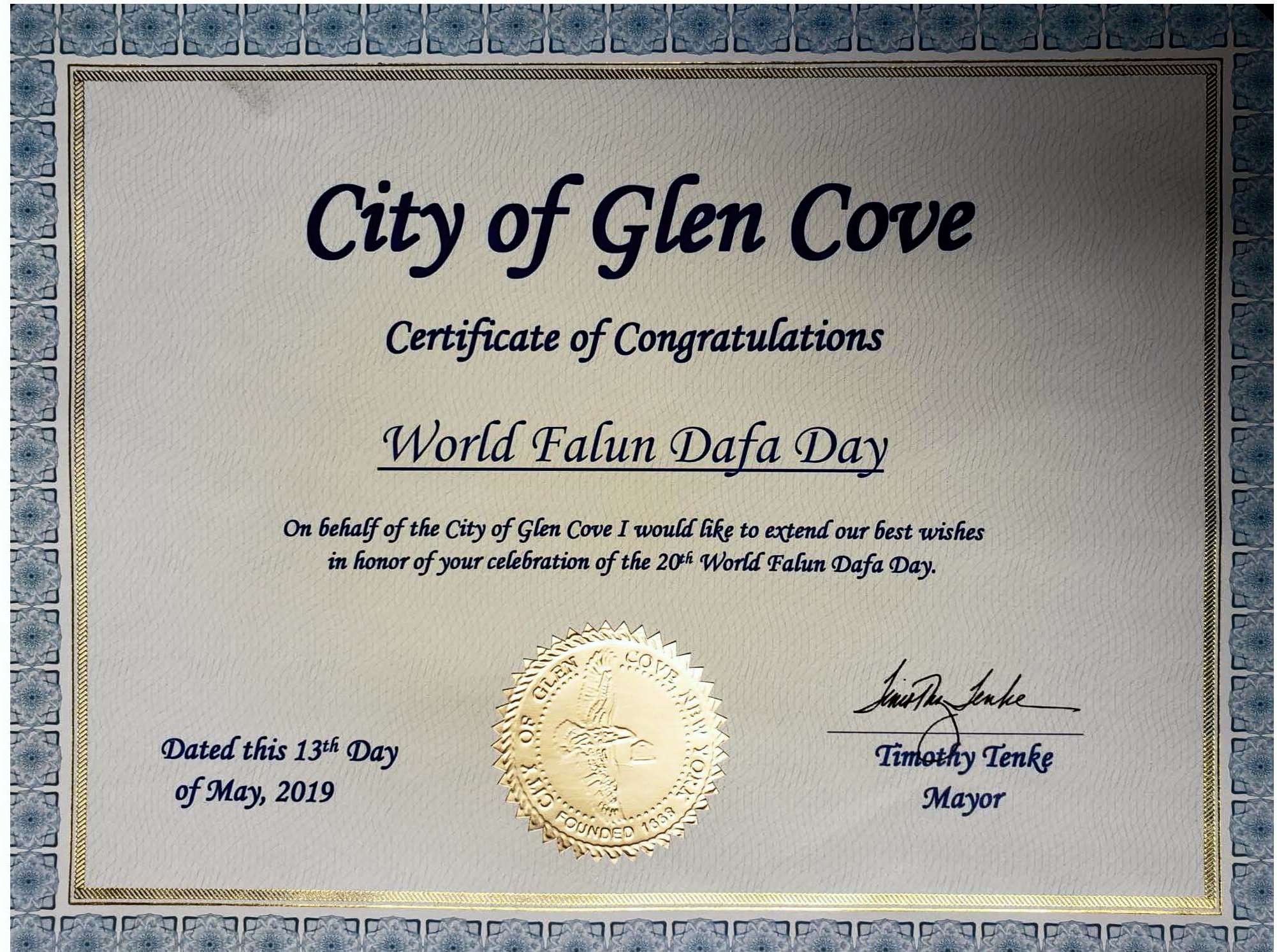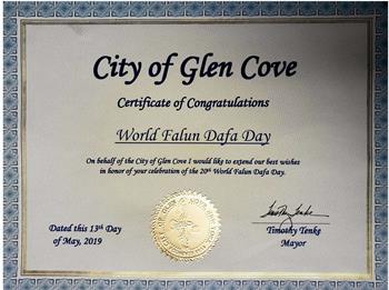布鲁克海文镇宣布第20届世界法轮大法日 褒奖译文如下: 鉴于:布鲁克海文镇希望称颂那些为我们社区的居民热心地贡献和服务的团体。在5月13日,来自世界各地的人们在纽约聚集以庆祝第20届世界法轮大法日,也标志着其问世27周年。并且: 鉴于:自从1992年,通过修炼法轮大法,也叫法轮功,使得全世界千百万的人变得更加健康,快乐,及为他。法轮大法是根源于中国传统文化中的一个平和的信仰。他有打坐,5套柔和的功法,以及修炼者作为日常生活指导的以真、善、忍的价值为核心的道德哲学。并且: 鉴于:根源于古老的中国精神传统,法轮功最初由创始人李洪志先生1992年在中国传出。千万中国公民通过修炼得到了更好的健康及精神上的幸福,因此,口耳相传使其发展迅速。今日,法轮功在全世界114个国家有不同年龄及阶层的人修炼。他一直有志愿者免费教授,个人或集体炼均可。并且: 鉴于:在长岛,在过去的22年里,当地法轮大法学员资助并/或参与了众多当地活动,参加社区街市及游行。他们展示了中国古典音乐及舞蹈的文化,并在老年中心,公司办公室,健康会所,公园,图书馆,及私人住宅举办了无数免费教功班。 现在,鉴此,我,Edward P. Romaine,布鲁克海文镇的管理者以及镇议会的成员们,代表布鲁克海文的500,000 居民以极大的荣幸在2019年5月13日公告今日为:布鲁克海文镇第20届世界法轮大法日。 格伦湾市祝贺大法日  格伦湾市发来证书祝贺法轮大法日。 |