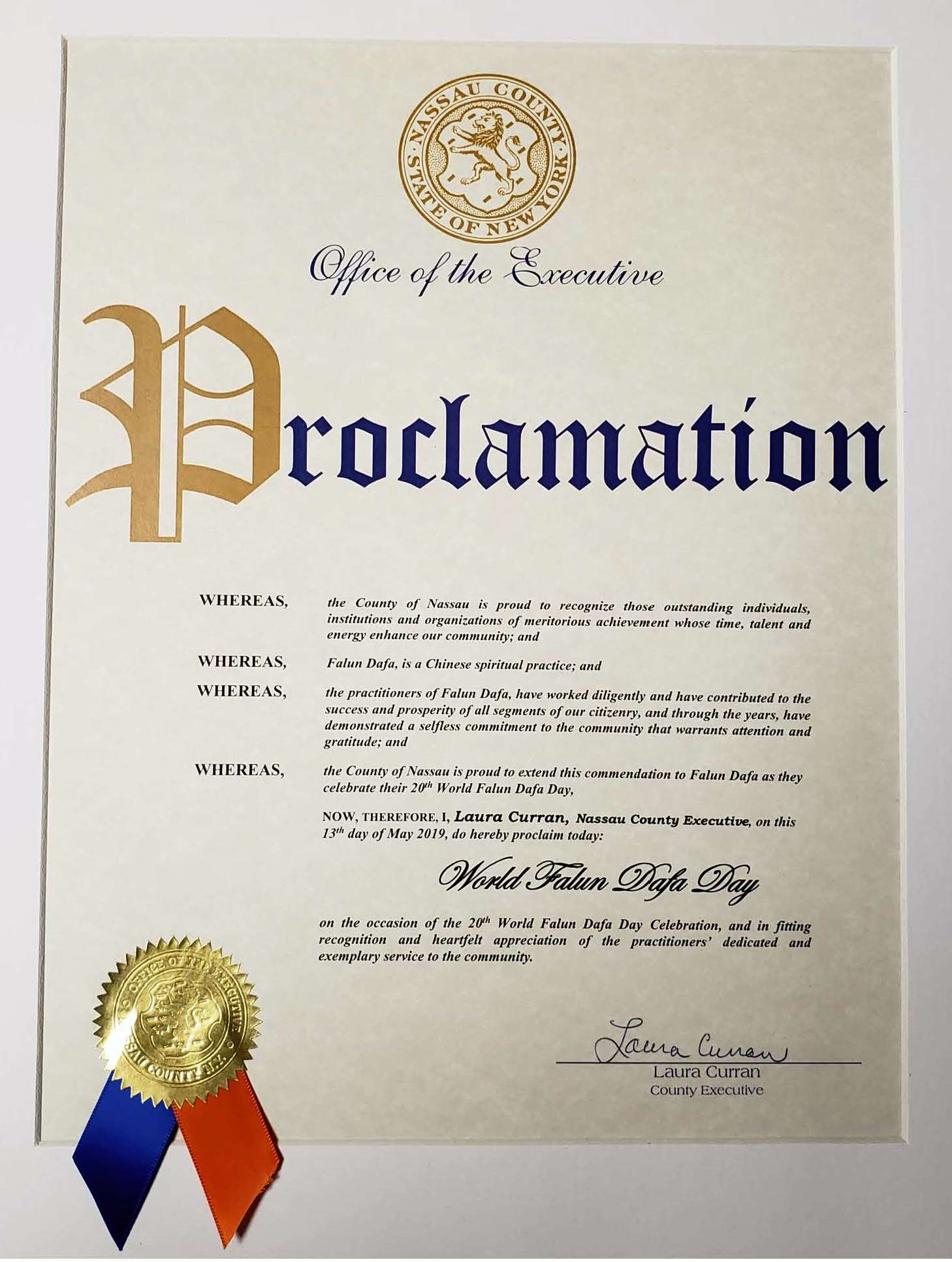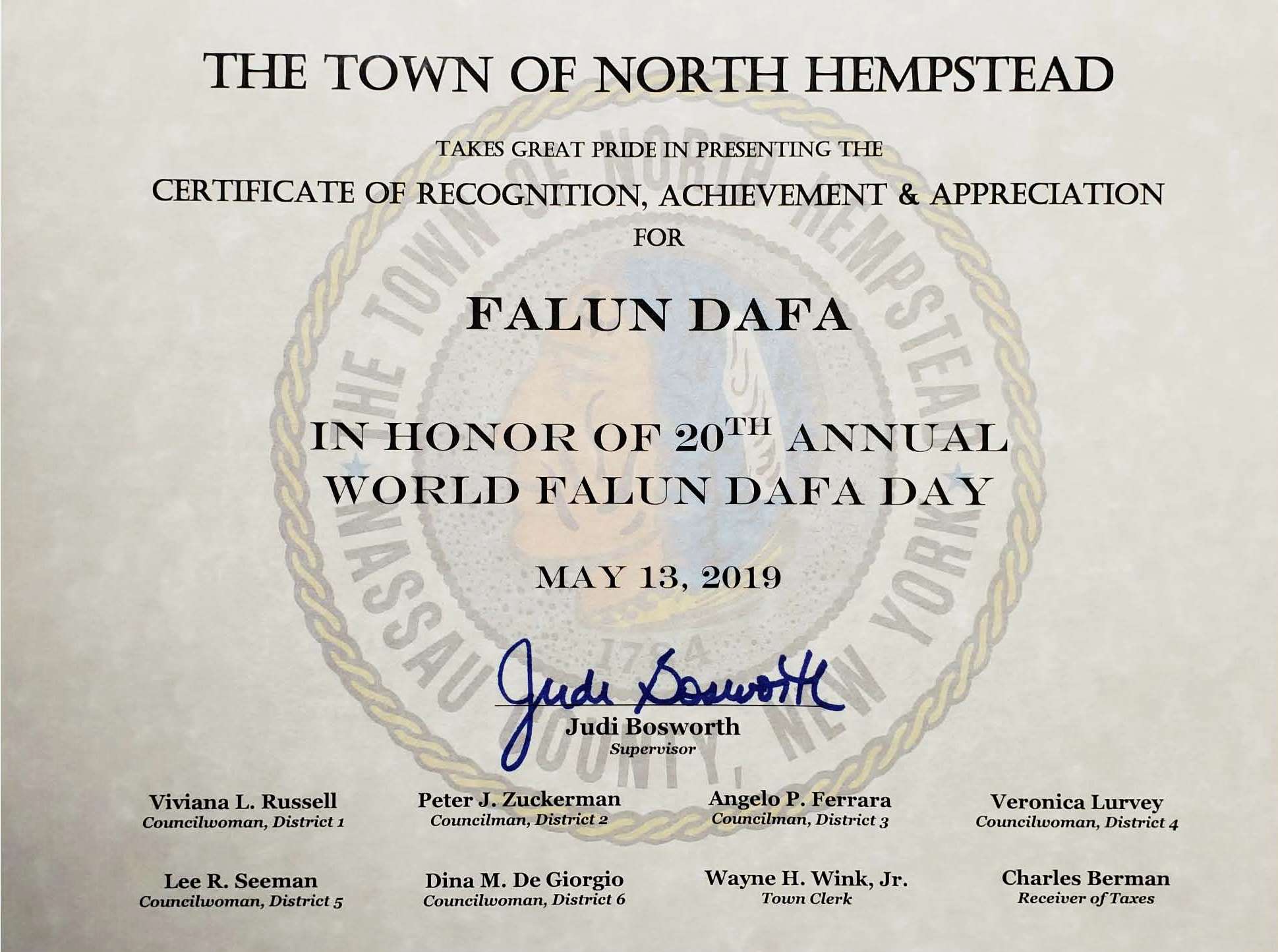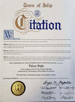 伊斯利普镇颁发褒奖祝福法轮大法 褒奖译文如下: 鉴于:我镇有众多居民过着无私的生活;不求回报地努力对他们的社区进行改善。他们认为自身造成积极影响已是足够的回报。并且: 鉴于:法轮大法,一个闻名世界的修炼功法,自1992年传出,使世界各地过亿的人变得更加健康,快乐。使他们关心他人,注重真、善、忍的标准以及跨越文化,国籍,种族,性别及年龄的普世价值。并且: 鉴于:世界各地法轮大法学员为社区无数小时的奉献,组织免费功法学习班,展示中国文化的音乐及舞蹈作品,并通过打坐教育,柔和的功法和道德哲学积极地改善拥有众多人口国家的未来。并且: 鉴于:法轮大法,在长岛过去23年里,一直作为我们本地社区宝贵的指导和灵感来源,自愿为老年市民,公司,健康俱乐部,公园,图书馆及私人住宅资助和开办上千次免费功法学习班,并参与社区游行及街市活动,持续着他们优良及和平的传承。所以: 现在,我们,伊斯利普镇政府, 在这第二十个世界法轮大法日,标记着法轮大法传世27年, 表彰法轮大法。 我们祝愿他们在未来越办越好。 拿萨县颁发褒奖祝贺大法日 褒奖译文如下: 鉴于:拿萨县荣幸地嘉奖那些杰出的值得称赞的个人,机构及组织。他们用时间,天赋,及精力丰富了我们的社区。并且: 鉴于:法轮大法,是一个中国的信仰。并且: 鉴于:法轮大法学员兢兢业业的付出并对我们公民的各个方面的成功与繁荣作出了贡献。经过这些年,他们展示了对社区无私的贡献,值得人们关注和感激。并且: 鉴于:拿萨县荣幸地将此表彰在他们庆祝第20届世界法轮大法日之际给予法轮大法。 现在,鉴于此,我,Laura Curran,拿萨县执行官,在2019年5月13日,第20届世界法轮大法日欢庆之际,在此公告今日为:世界法轮大法日 以此嘉奖并衷心感激学员们对社区的细心,模范性的服务。 北亨普斯特德镇祝贺大法日  北亨普斯特德发来证书祝贺法轮大法日。 |