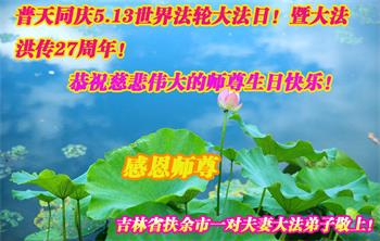 普天同庆世界法轮大法日暨大法洪传27周年! 吉林省扶余市一对夫妻大法弟子恭祝师尊生日快乐!