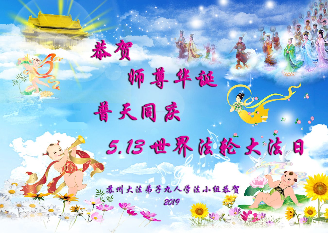 【明慧网二零一九年五月八日】 江苏苏州大法弟子九人学法小组恭贺世界法轮大法日暨师尊华诞!