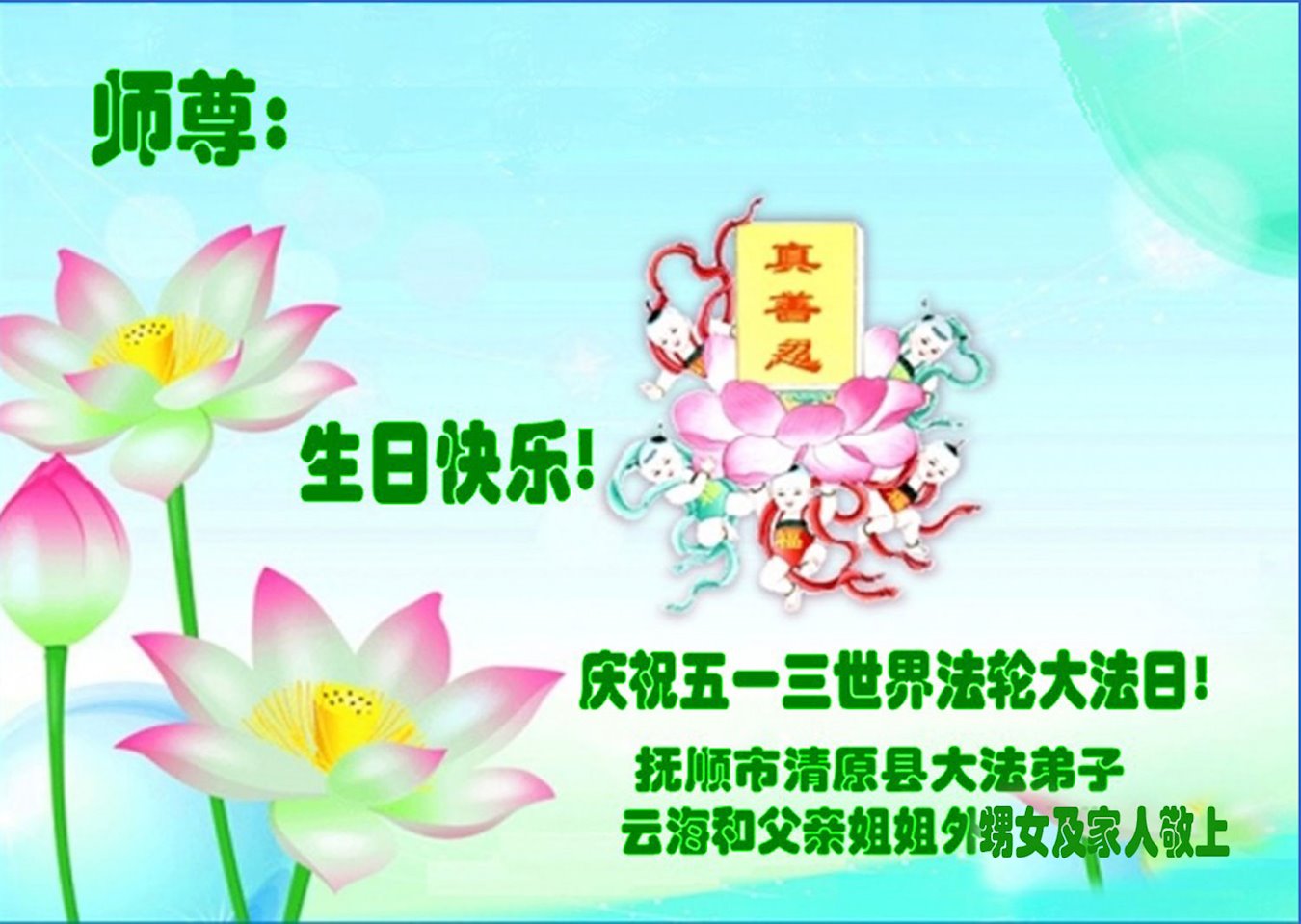 【明慧网二零一九年五月八日】 辽宁省抚顺市清原县云海、父亲、姐姐、外甥女四名大法弟子及家人恭祝师尊生日快乐!