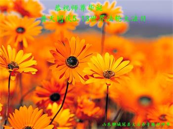 师父好!师父生日快乐! 如果没有师父救我,我也不可能这么好,我万分感谢恩师。 5月13日是世界法轮大法日,也是师父的生日,在这个伟大的日子,弟子祝师父生日快乐!我没上过学不认字,但是我听师父的话,做好三件事,多学法,多救人完成使命,跟师父回家。 山东省聊城市冠县大法弟子恭祝慈悲伟大的师父生日快乐!