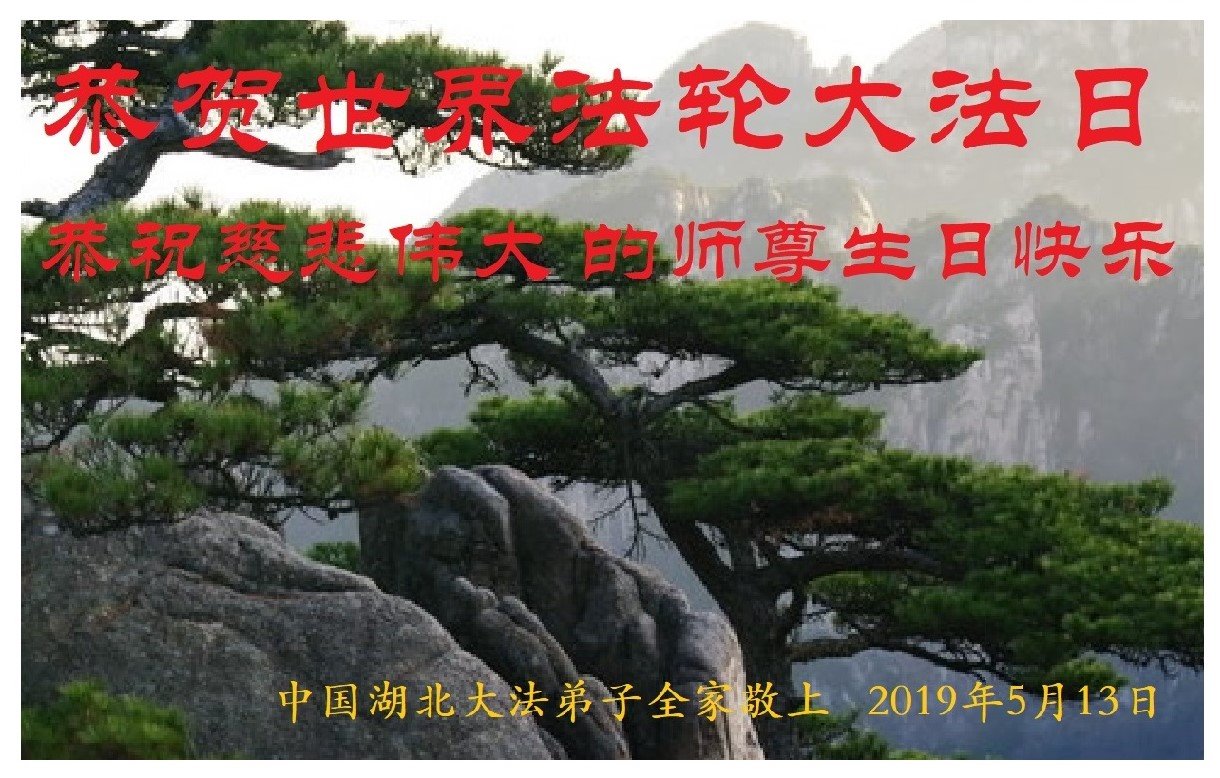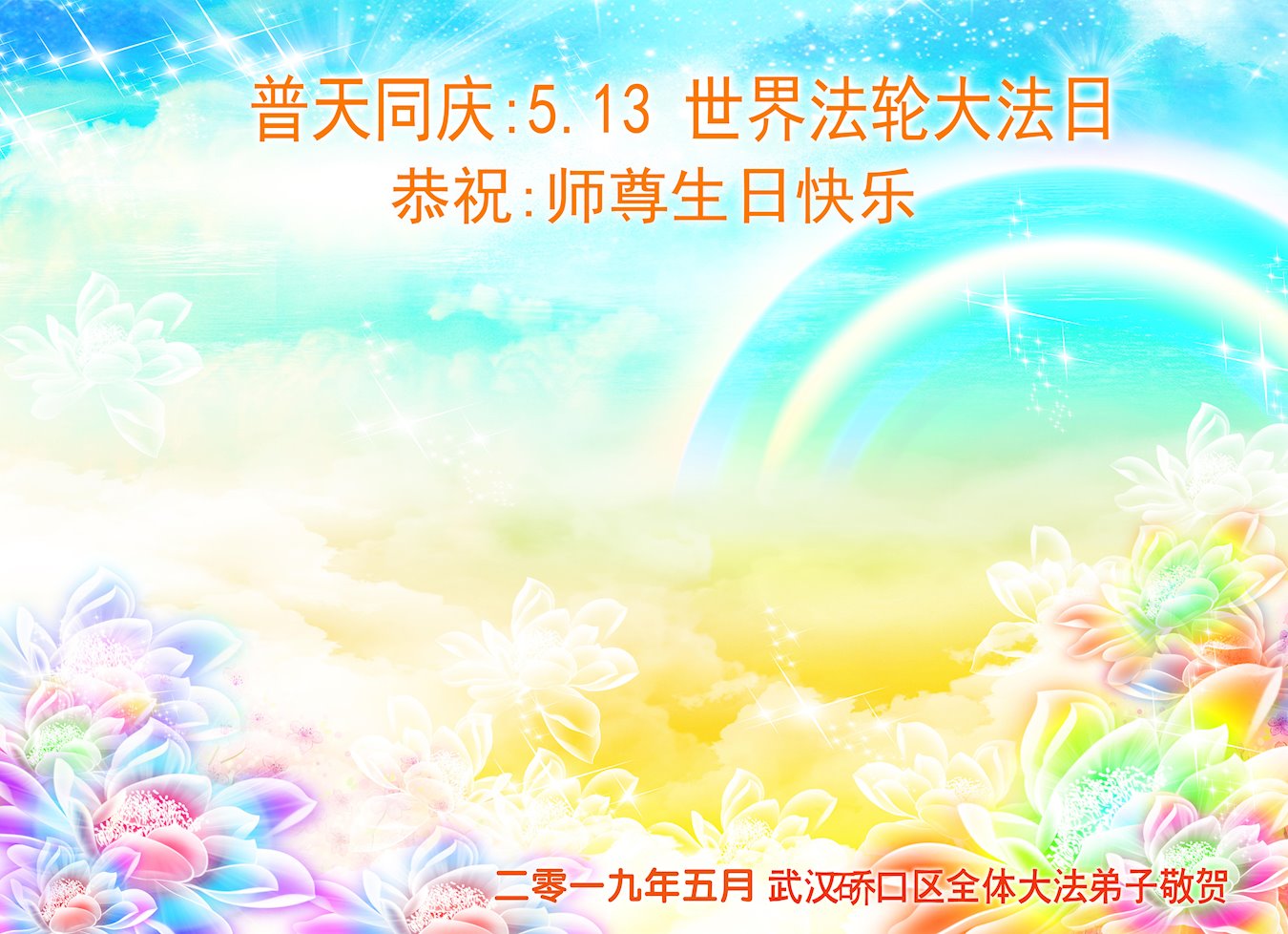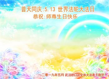 又是五·一三世界法轮大法日,不精進弟子感谢师父慈悲苦度,让师父操心,弟子一定坚修大法到底。 大陆湖北大法弟子 二零一九年五月五日 湖北省武汉东西湖区大法弟子恭贺5.13世界法轮大法日!恭祝师父生日快乐!