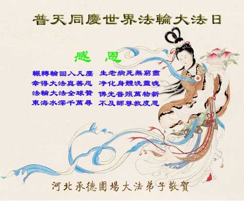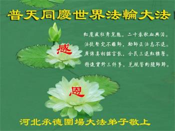 河北承德围场县全体大法弟子恭贺世界法轮大法日暨师尊生日快乐! 感恩 辗转轮回入迷尘,生老病死无穷尽, 幸得大法真善忍,净化身体洗灵魂, 法轮大法全球赞,佛光普照万物新, 东海水深千万寻,不及师尊救度恩。 河北承德一大法弟子恭祝师尊生日快乐!