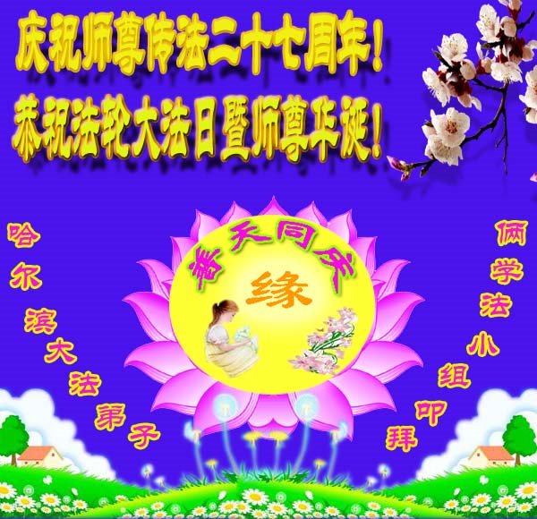祝贺法轮大法洪传二十七周年! 黑龙江省哈尔滨市道里区两个学法小组大法弟子恭祝伟大的师尊生日快乐!祝贺法轮大法洪传二十七周年!