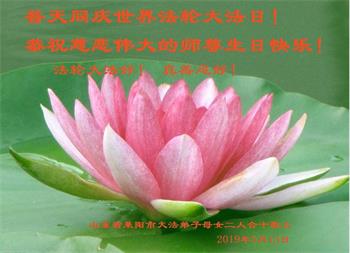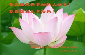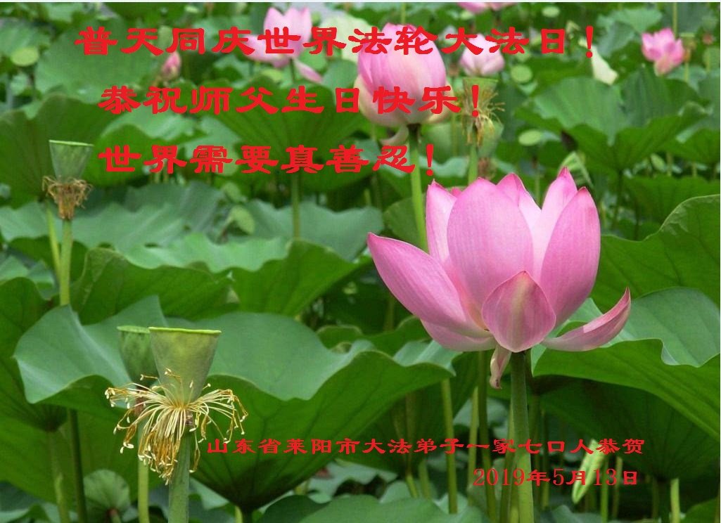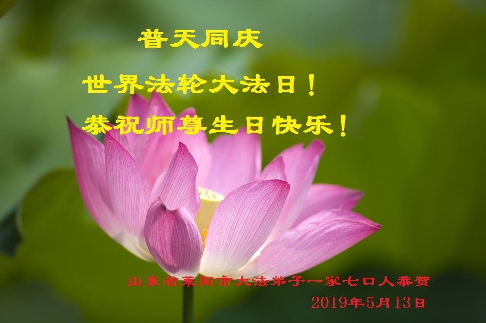 【明慧网二零一九年五月九日】 山东省烟台市莱阳市大法弟子一家七口人恭祝慈悲伟大的师尊生日快乐!恭贺世界法轮大法日!