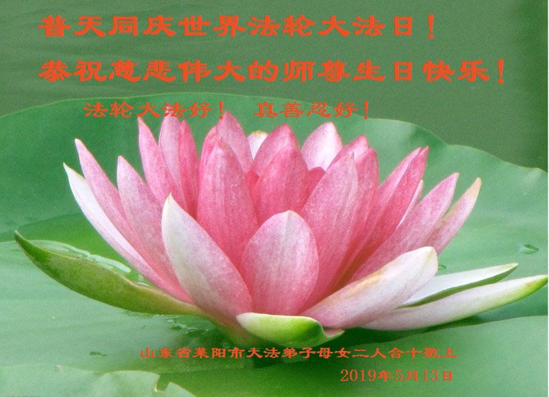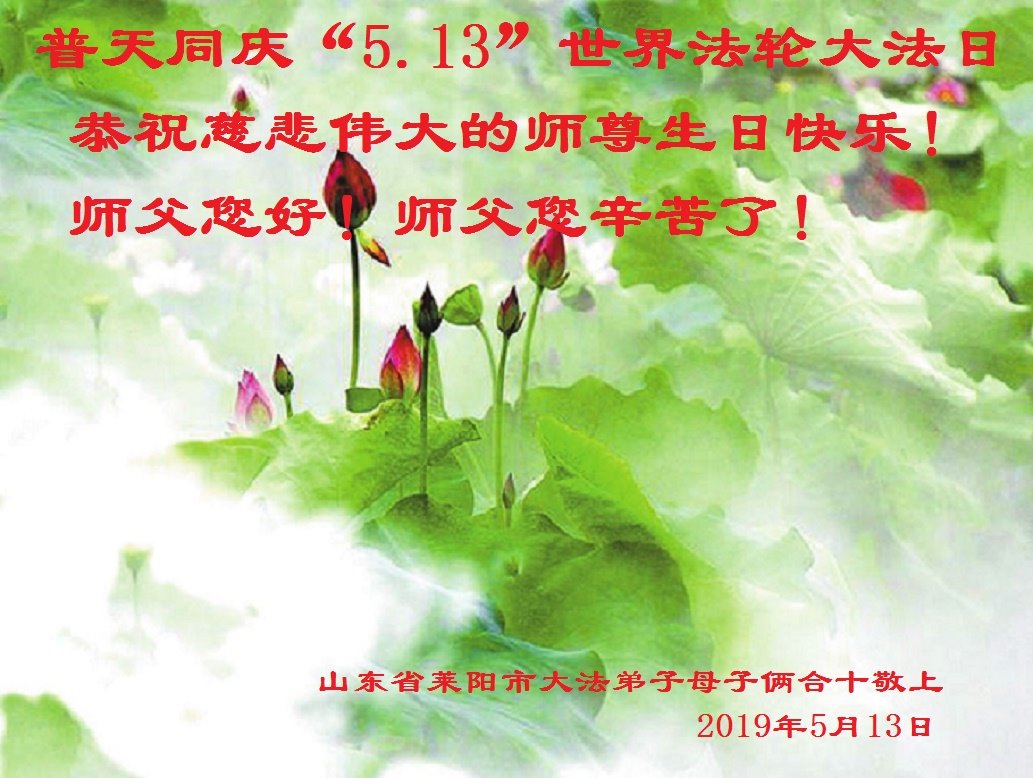 山东省烟台市莱阳市大法弟子母子俩恭祝慈悲伟大的师尊生日快乐!恭贺世界法轮大法日!