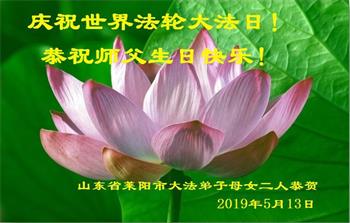 山东省烟台市莱阳市大法弟子母女二人恭祝慈悲伟大的师尊生日快乐!恭贺世界法轮大法日!