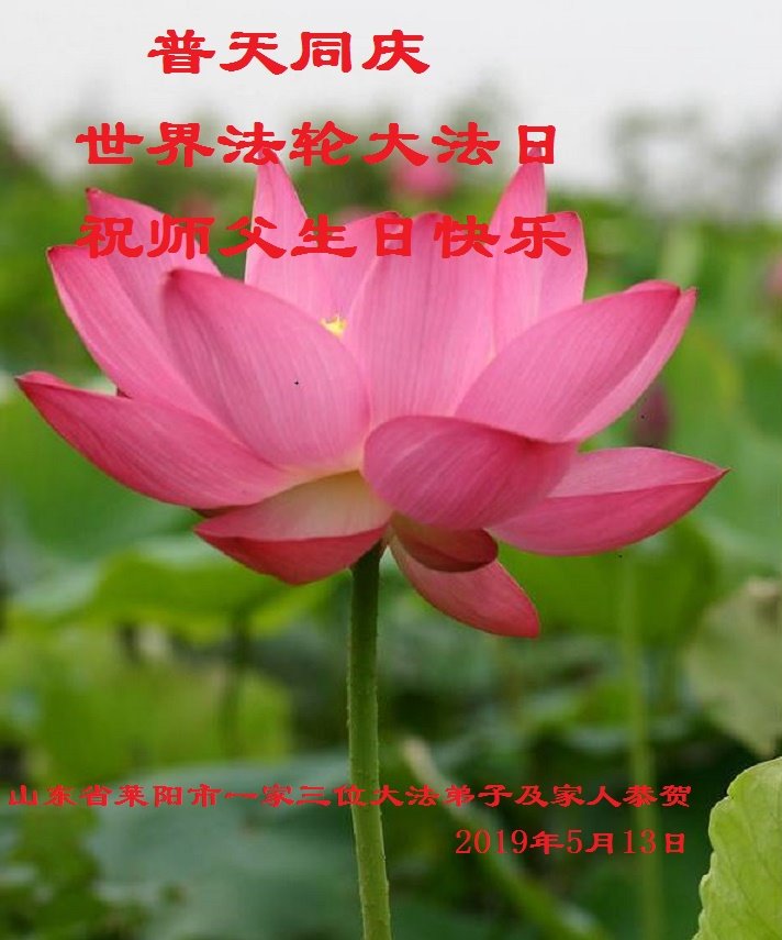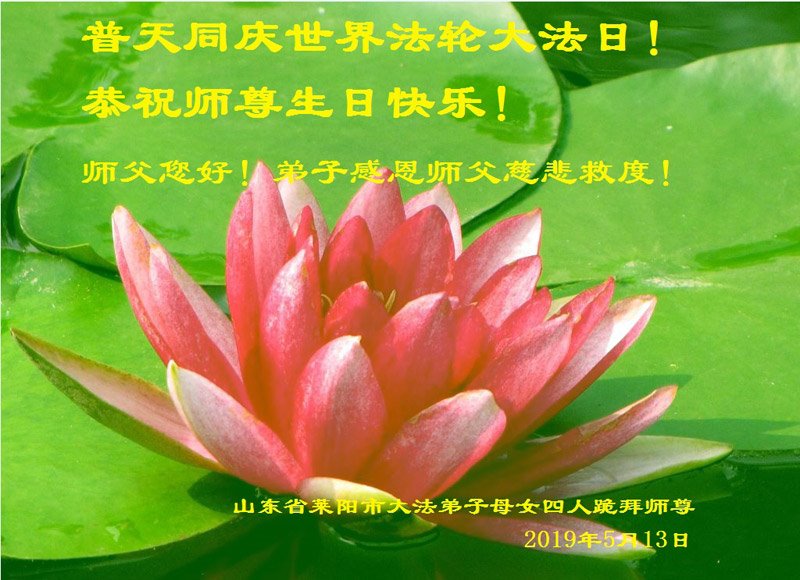 山东省烟台市莱阳市大法弟子一家四口人恭祝慈悲伟大的师尊生日快乐!恭贺世界法轮大法日!