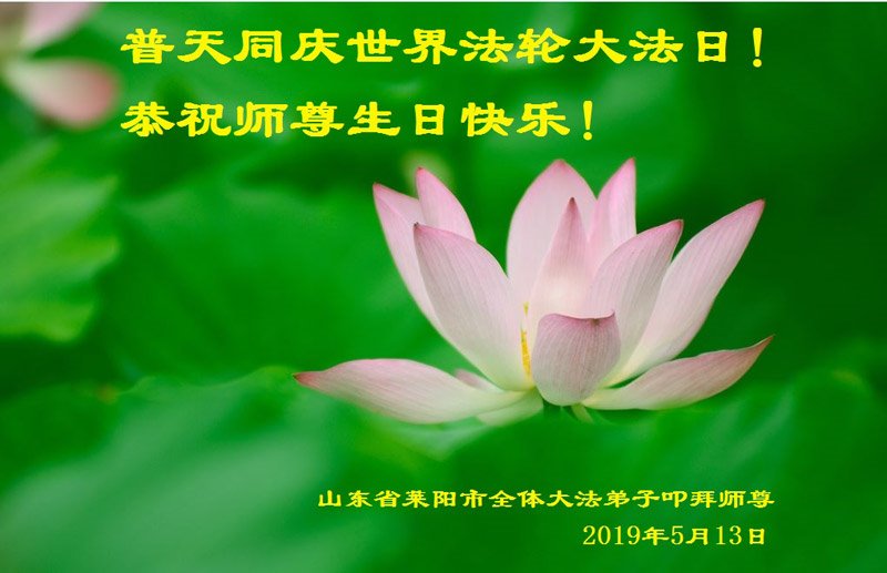山东省烟台市莱阳市全体大法弟子恭祝慈悲伟大的师尊生日快乐!恭贺世界法轮大法日!