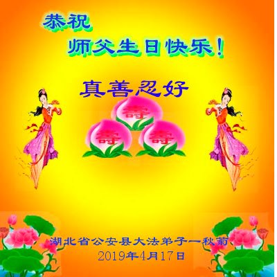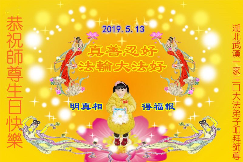 我们一定要做好三件事,精進实修。感谢师父保护!感谢师父! 咸宁市黄畈社区大法弟子 二零一九年五月二日 湖北省武汉市一家三名大法弟子恭祝慈悲伟大的师尊六十八华诞暨世界法轮大法日!