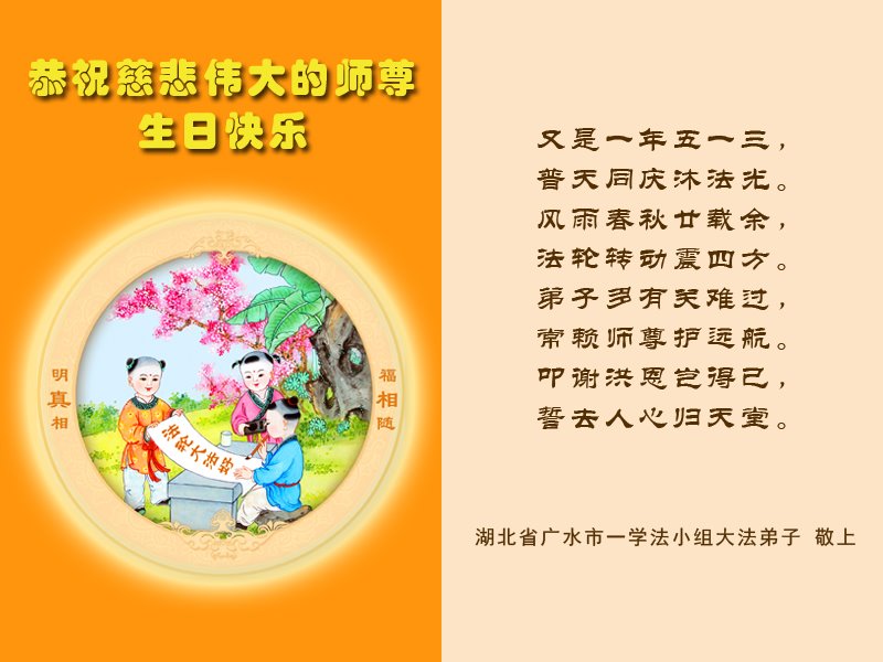 又是一年五一三, 普天同庆沐法光。 风雨春秋廿载余, 法轮转动震四方。 弟子多有关难过, 常赖师尊护远航。 叩谢洪恩岂得已, 誓去人心归天堂。 湖北省荆州市大法弟子恭祝师父生日快乐!